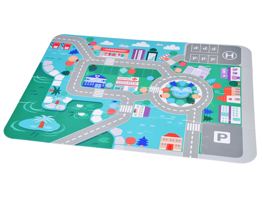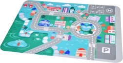 Matt kujutab linnamaastikku koos märgitud teede ja parkimiskohtadega, julgustades lapsi õppivalt mängima sõidukitega.