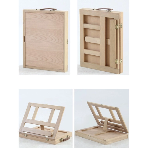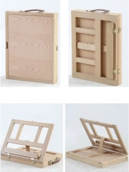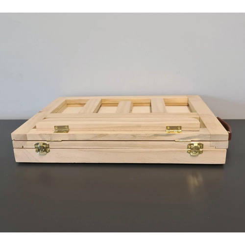 Puidust kohver on varustatud sahtli ja molbertiga, mis tagavad kunstitarvete lihtsa transportimise ja korrastamise.