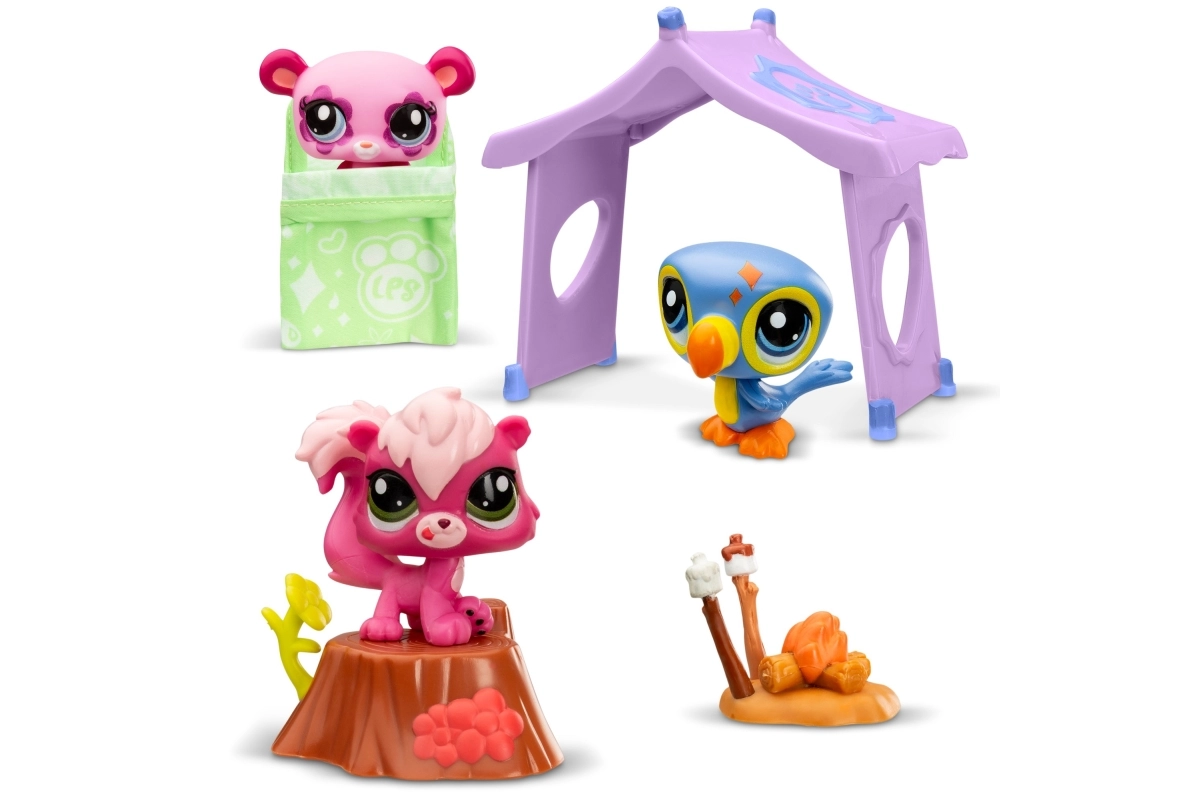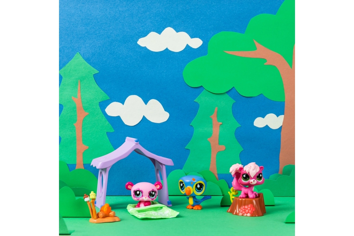 Alusta oma telkimisseiklust kolme võluva Littlest Pet Shopi loomakesega: panda, tuka ja oravaga. Nende figuuridega saad lasta loovusel lennata, nautida lõbusat aega lõkke ääres või puhata mugaval puukännul. Komplekt sisaldab: