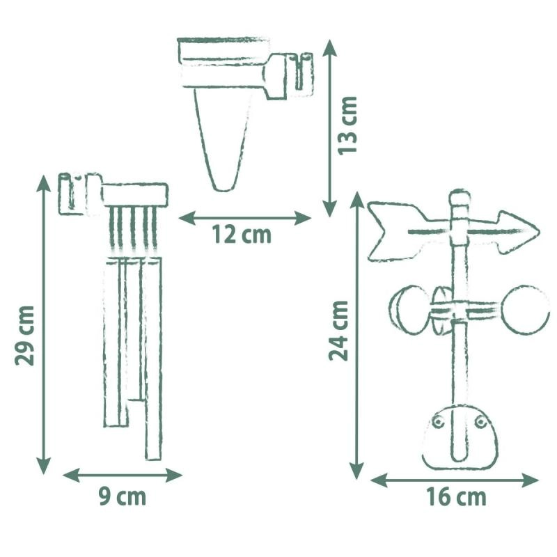 Muutke mängumaja väikeseks ilmajaamaks. See lõbus-õpetlik komplekt arendab uudishimu ja praktilisi oskusi – lapsed saavad jälgida tuule suunda ja kiirust, mõõta sademeid ning samal ajal tajuda ümbritsevat maailma tuulekella õrnade helide saatel.