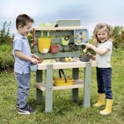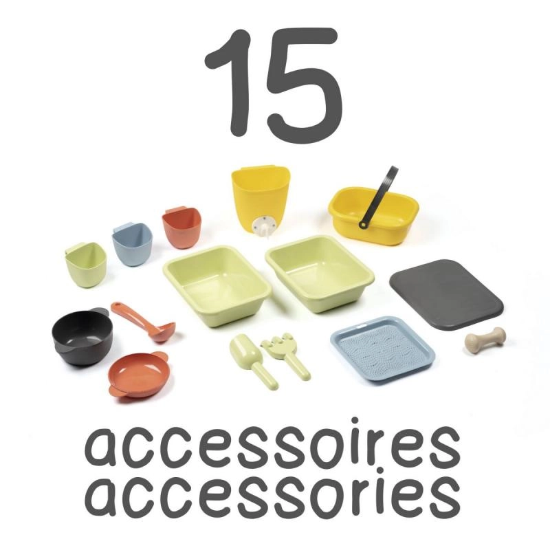 Komplekti kuulub 15 praktilist tarvikut (sõel, korv, kulp, rehits, labidas jm), panemispinnad, konksud ja mahuti kate „aardete“ peitmiseks ja hoiustamiseks. Kvaliteetsest plastist konstruktsioon UV-kaitsega on värvikindel ja sobib välitingimustesse.