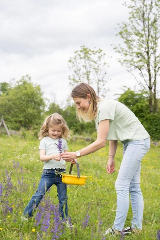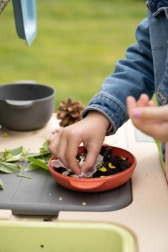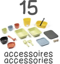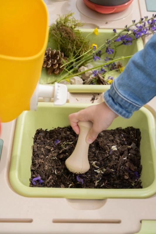 Sõel, korv, kulp, rehits, labidas ja muud tarvikud inspireerivad pori-, liiva- ja lillekokkamist ning toetavad ühist mängu.