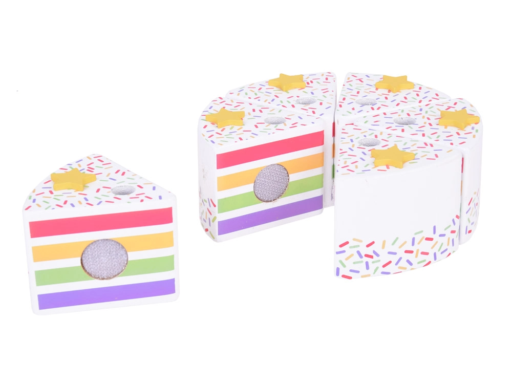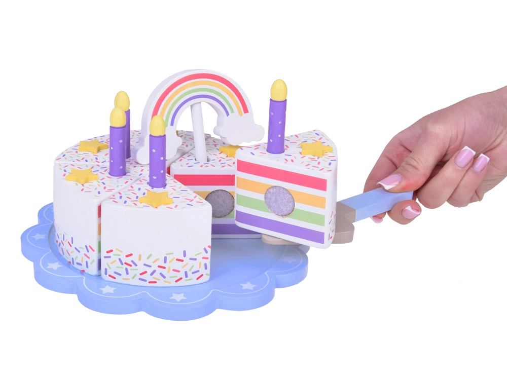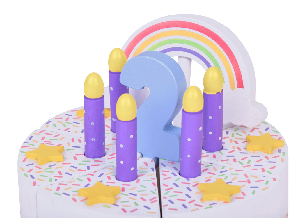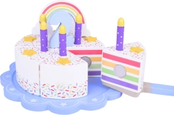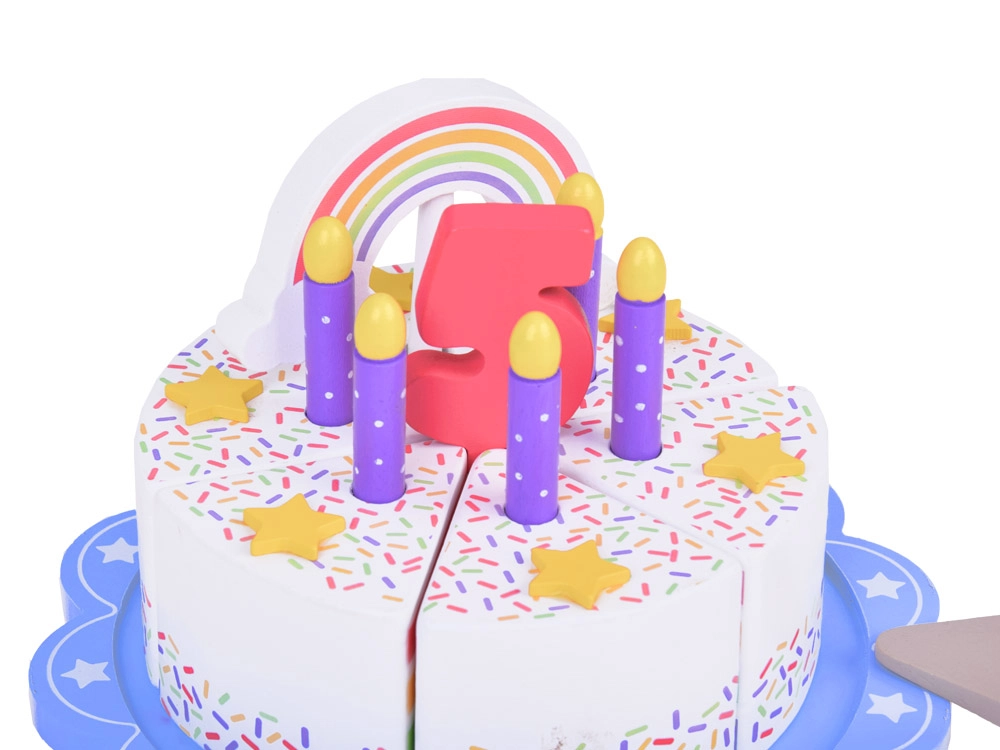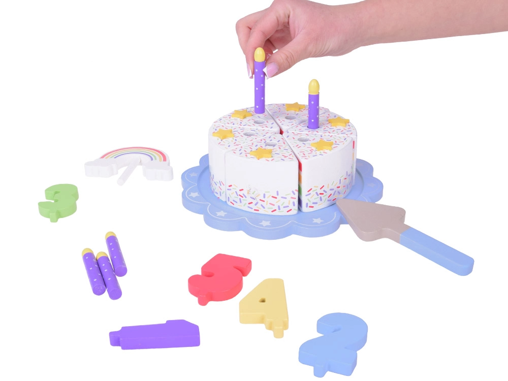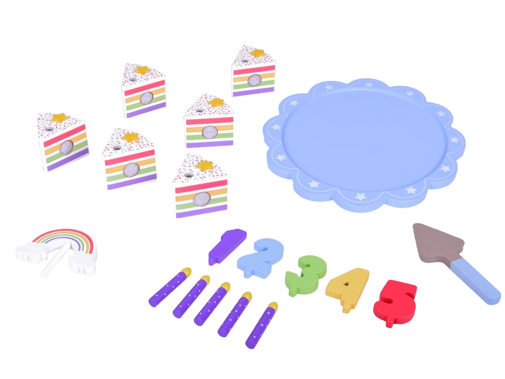 Tordi peal on eemaldatav värviline vikerkaar, mis lisab kogu komplektile võlu. Igal torditükil on koht küünlale, muutes selle ideaalseks valikuks sünnipäevapeo mängimiseks.