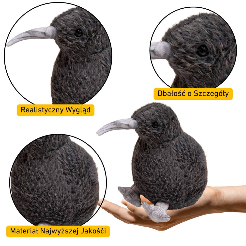 See elegantse musta värviga plüüsist kiwimaskott paistab silma realistliku teostuse ja pehme pinnaga, mis lausa kutsub kallistama. Tänu hoolikalt viimistletud detailidele – pikk nokk, pisikesed jalad ja kohev tekstuur – mõjub see väga usutavalt ja saab lemmikuks kaaslaseks lastele alates 3. eluaastast.