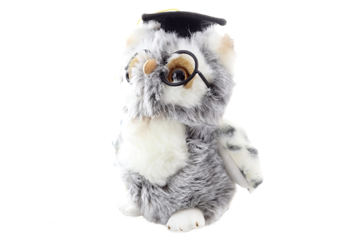 Välimust täiendavad must lõpetajamüts ja ümmargused prillid, sümboliseerides tarkust ja edu. See plüüšmänguasi on suurepärane mängukaaslane ning kaunis lisand igasse interjööri.