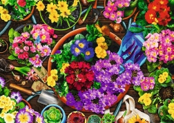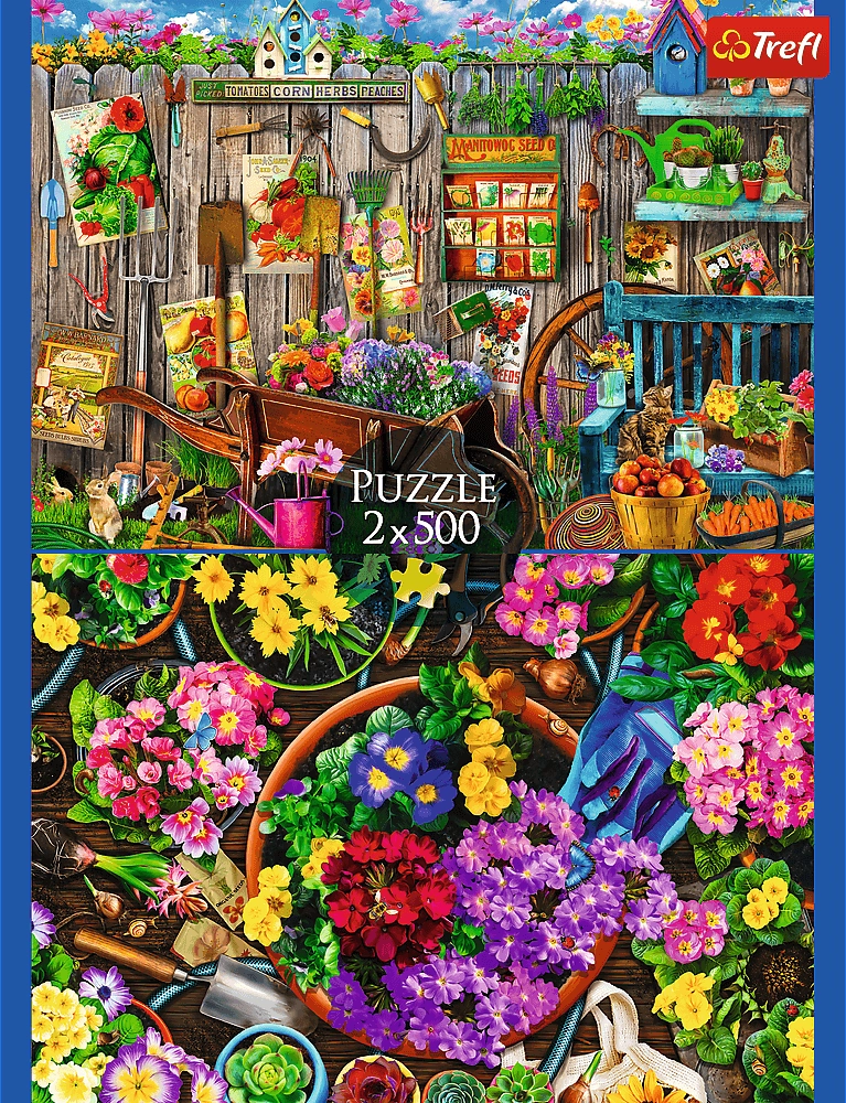 Komplekt sisaldab kahte eraldi 500 tükist puslet, mis kujutavad lõbusat ja värvikat aiastseeni, mis on täis lilli ja aiandustarbeid. Tänu kvaliteetsele trükile tulevad esile nii erksad värvid kui ka peened detailid, nii et puslepanek on tõeliselt nauditav.