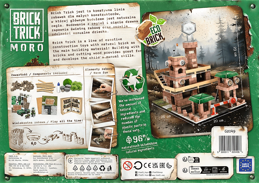 Trefl Brick Trick komplektiga saad arendada oma loovust ja käelisi oskusi. Laod järk-järgult tellise tellise haaval, lõikad ja liimid puidust liiste. Sina otsustad, milline sinu sõjaväebaas välja näeb, ning võid isegi ellu viia oma ideid.