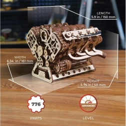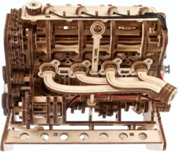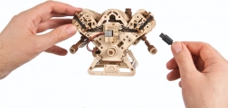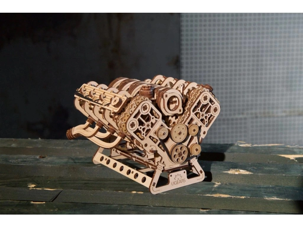 Puidust mehaaniline V8 mootori mudel jäljendab truult päris kaheksasilindrilise tööpõhimõtet: kaheksa silindrit rütmiliselt liikuvate kolbidega, 16 klappi, mida juhivad nukvõllid, ajastus reguleeritava ketiga (32 lüli) ning abiseadmed ussrihmaga. Tänu toitele USB‑C kaudu või käsitsi pööramisele naudite realistlikke mehaanilisi liikumisi ja mõistate paremini sisepõlemismootori tööpõhimõtteid.