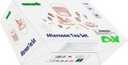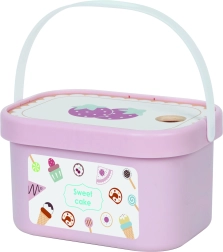 Komplektis on ka toredad nõud – tassid, teelusikad, kahvlid ja nuga – ning vastupidav plastkarp sangaga lihtsaks hoiustamiseks ja kaasaskandmiseks. Pastelsed värvid ja siledad, lastele ohutud detailid kutsuvad mängima nii üksi kui ka seltskonnaga.
