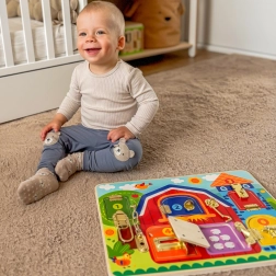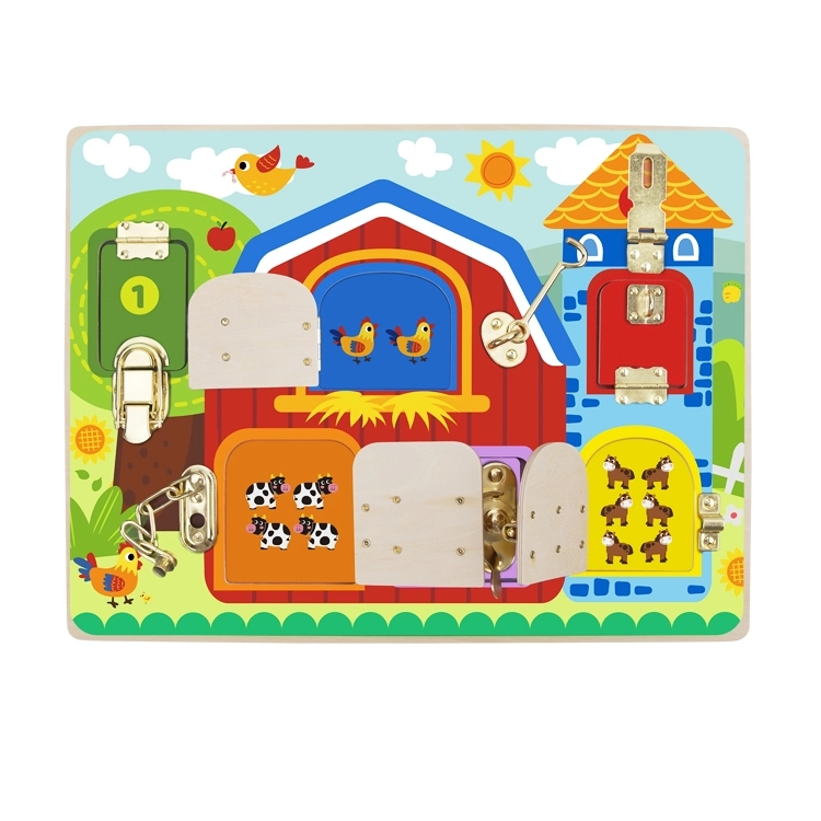See kvaliteetne puidust tahvel pakub 6 hingedega akent erinevate mehhanismidega – klassikalistest kinnitusklõpsudest kuni kettide ja konksudeni. Lapsed harjutavad sõrmi, keskendumist ja kannatlikkust, kui nad iga lukku avavad ja sulgevad, et avastada armsaid loomapilte.