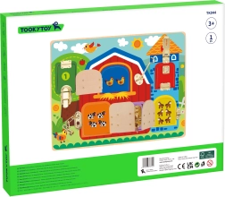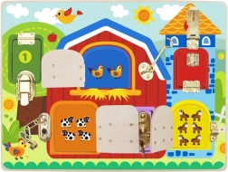 Avastage lõbus ja hariv mänguasi lastele alates 3. eluaastast: Tooky Toy puidust farmiteemaline tegevustahvel. Kuus värvilist ust erinevate lukkude, kinnitusklõpsude ja ketikestega arendavad peenmotoorikat, loogilist mõtlemist ja silma–käe koordinatsiooni, samal ajal kui uste taga ootavad loomapildid toreda üllatusena.