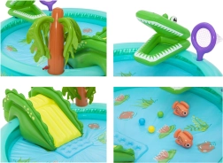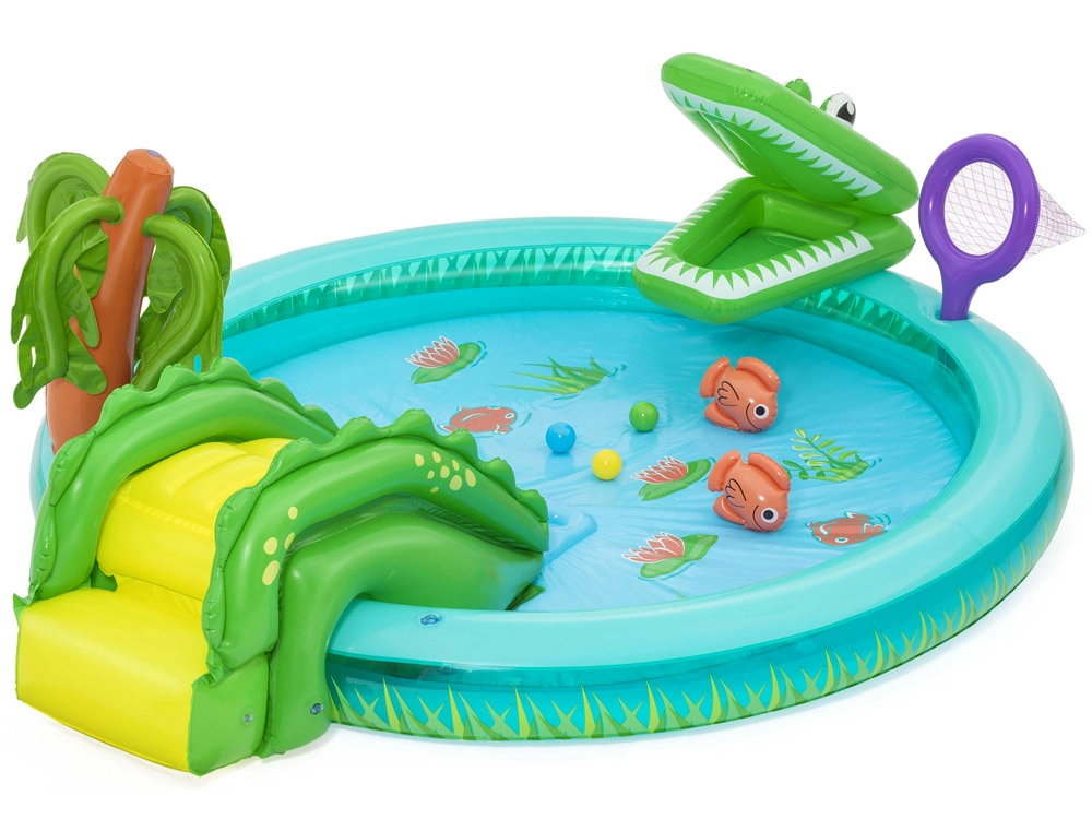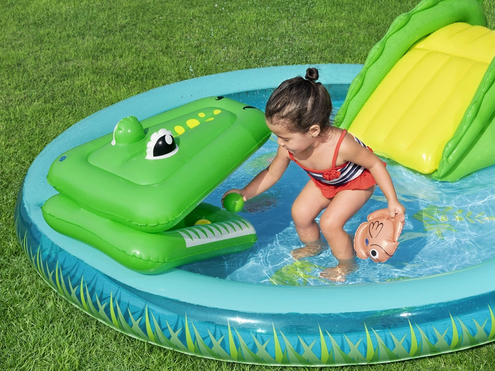 Pakuge lastele naerurohket suve BESTWAY krokodilliteemalise täispuhutava veemänguväljakuga. Komplekt ühendab liumäe pehme maandumisalusega, aiavoolikuga ühendatava palmikujulise pihusti ning lõbusad tegevused, nagu pallide viskamine krokodilli suhu ja kalakeste püüdmine. Avardatud bassein mahuga 210 l sobib lastele alates 2. eluaastast ning pakub aias turvalist veemõnu.