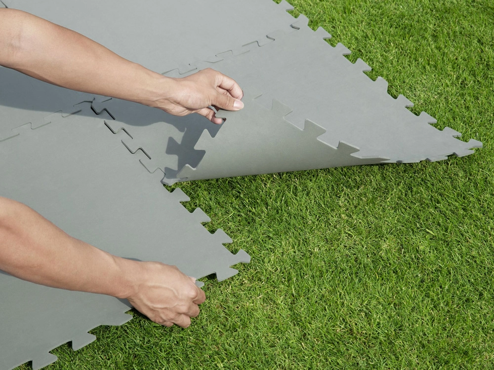Loo pehme, kaitstud ja soojusisoleeritud alus basseinidele, mullivannidele või mängualadele. Ühendatav puslesüsteem võimaldab kiiret kokkupanekut ja pinna lihtsat laiendamist, samas kui vastupidav vaht säästab muru, sillutist ja puitu ning aitab vähendada soojuskadu veest.
