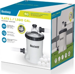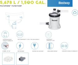 Võimas basseinipump BESTWAY vooluhulgaga 5678 l/h kristallselge vee jaoks. Kasutab Polysphere filtrikuule, mis tagavad mitmeastmelise filtreerimise, pikema tööea ja lihtsa hoolduse. Ideaalne maapealsetele basseinidele mahuga 1 100–31 700 l.