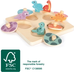 Avastage lõbus ja hariv puidust mälumängupusle dinosaurustega, mis on valmistatud 100% FSC-sertifitseeritud puidust. Komplekt ühendab nuputahvli ja memoriini ühes: värviliste dinosaurusemunade alla peidetakse vastavad dinosaurusefiguurid. Tänu puidust nuppkäepidemetele on tükke lihtne hoida ka kõige pisematel ning mäng arendab loomulikult peenmotoorikat, käe-silma koordinatsiooni, kannatlikkust, kontsentratsiooni ning värvide ja kujundite tajumist.