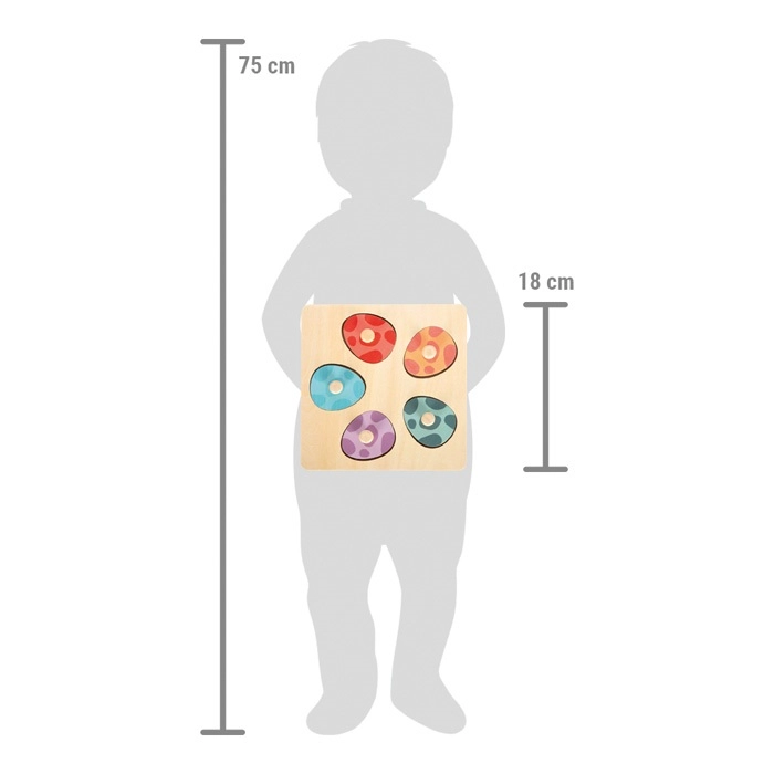 See tugev puidust mänguasi erksates värvides rõõmustab kõiki väikeseid dinosaurusesõpru. Kuue muna all peitub kuus puidust dinosaurust vastavates värvitoonides, nii et lapsed saavad treenida mälu ja sobitamist. Tänu praktilistele nuppkäepidemetele sobib mäng ideaalselt esimeseks puslekogemuseks.