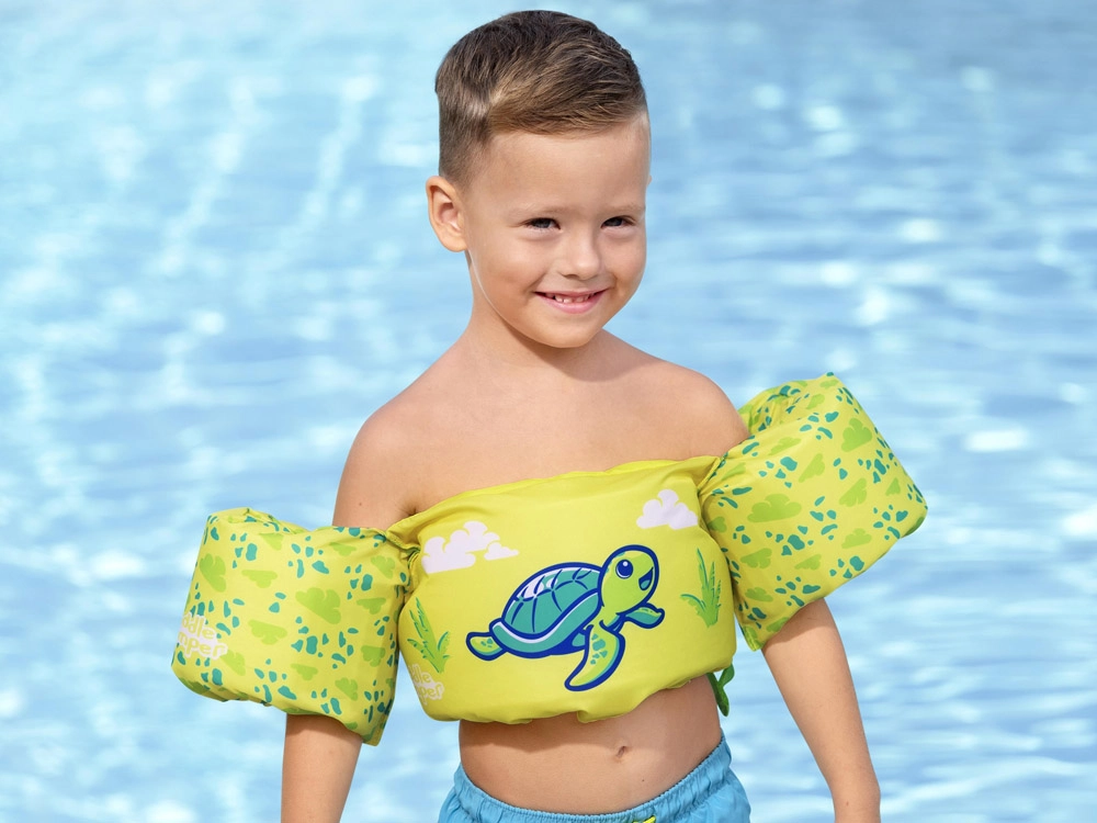 Otsid usaldusväärset abivahendit esimesteks ujumistõmmeteks? BESTWAY Puddle Jumper ühendab ujuvvesti ja varrukad üheks tervikuks, mis aitab lapsel hoida õiget asendit vees, piiramata liikumist. Lõbus kilpkonnamotiiv ja erksad suvised värvid motiveerivad aktiivsusele ja parandavad nähtavust vees.