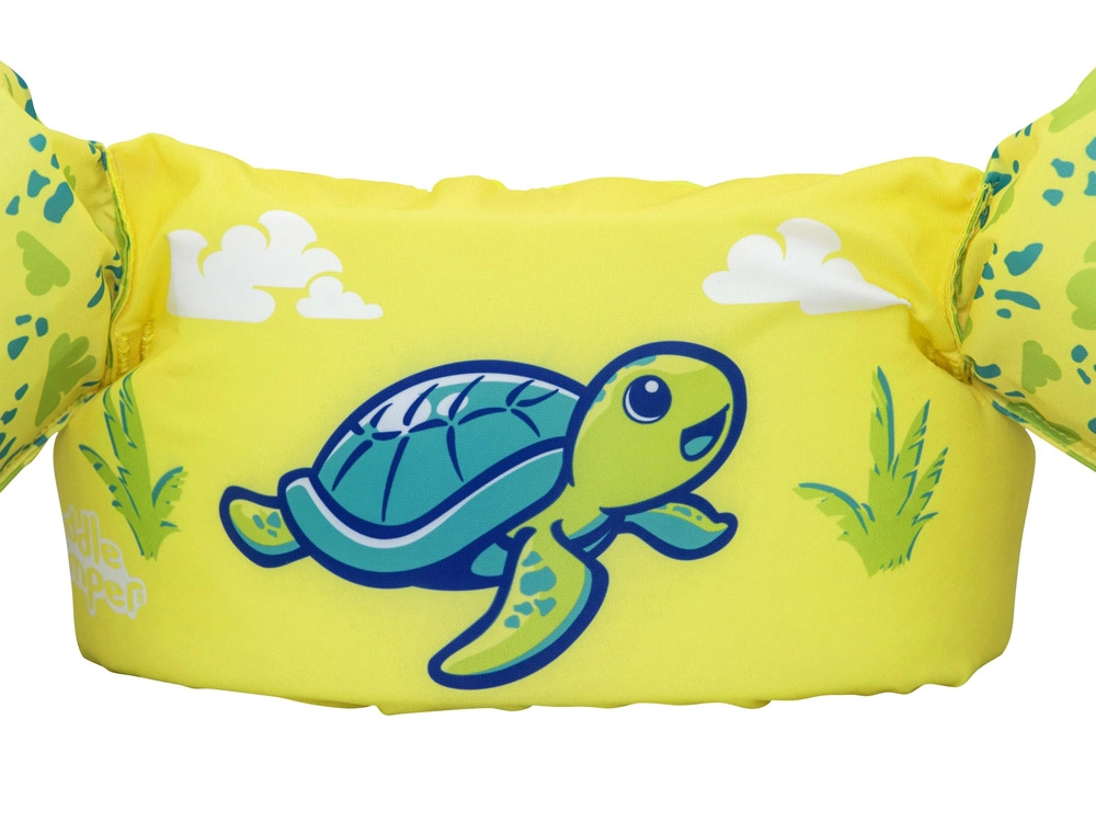 Rõõmsad värvid ja naeratav kilpkonn suurendavad vees nähtavust ja innustavad lapsi turvaliselt ujuma õppima ning igapäevaselt vees mängima.