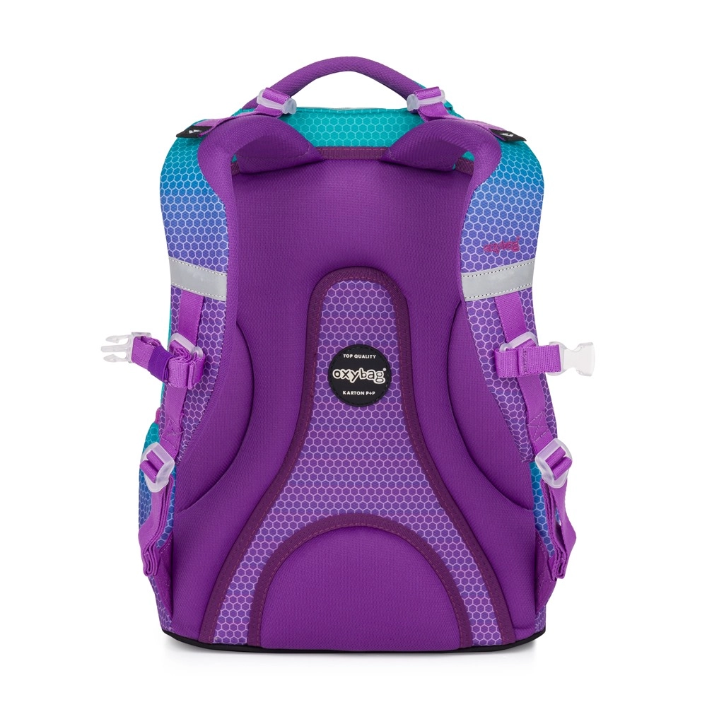 Oxy Ombre Blue Pink kooliseljakott köidab pilku modernse ombre-disainiga türkiissinise ja lillaka kombinatsioonis, mida täiendab heksagonmuster. Anatoomiliselt vormitud seljapaneeli ning polsterdatud, reguleeritavate rihmadega tagab see kogu päeva mugavuse ka suurema koormuse korral. Tugev põhi võimaldab stabiilset seismist ja kaitseb sisu.