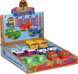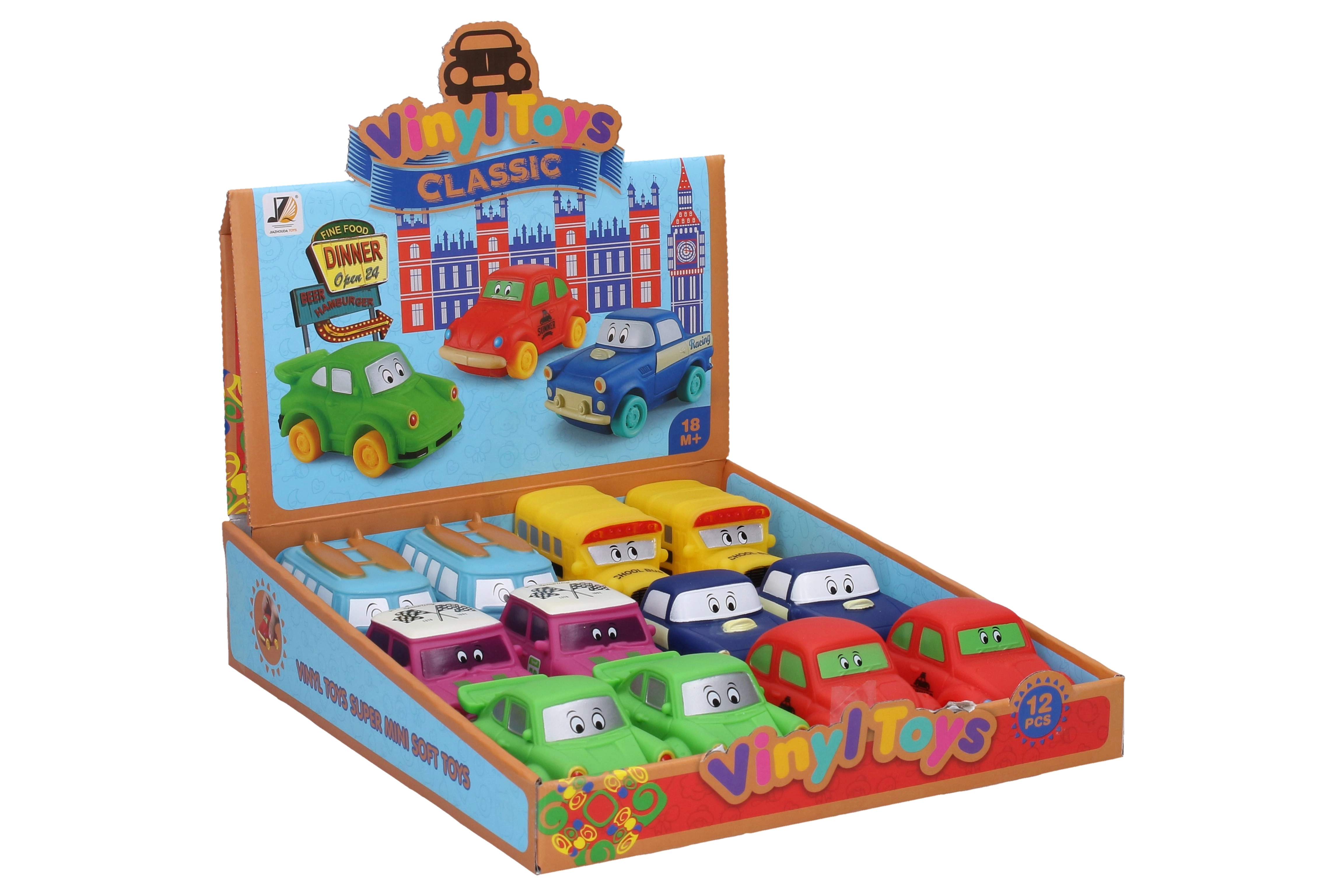 Kerge pehmest plastist auto pikkusega 9 cm ja vabalt veerevate ratastega. Valida on 6 variandi vahel: Põrnikas, Trabant, sportauto, Mini, autobuss, kaubik.
