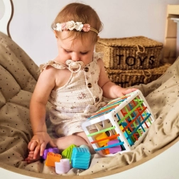 Iga tükk erineb tekstuurilt, värvilt ja kujult, mistõttu on mäng iga kord uus ja motiveeriv. Kui laps kasvab, sobib kuubik ka värvide, kujundite ja esimestele tähtedele keskenduvaks õppimiseks – ideaalne abivahend varaseks eelkooliealiseks ettevalmistuseks.