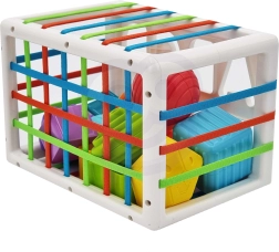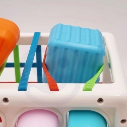 Tükkide sisestamine ja väljavõtmine läbi elastsete lintide ning klassikalise sorteerija õpetab last täpset haaret, arendab silma–käe koordinatsiooni ja toetab uudishimu uute kujundite ja tekstuuride avastamisel.