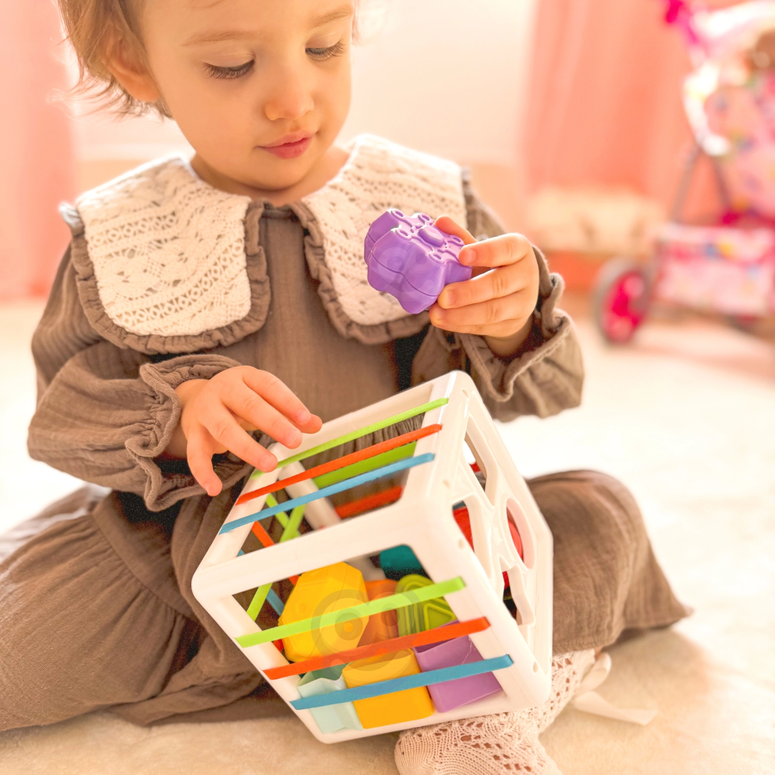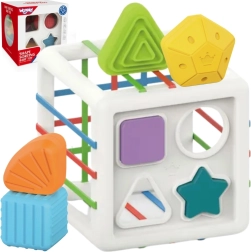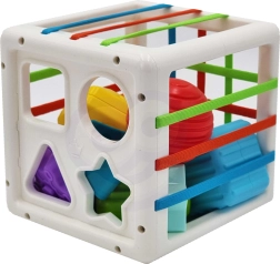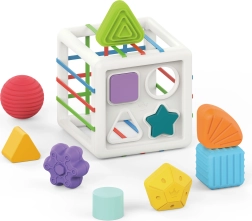 See värvikas sensoorne kuubik ühendab kaks populaarset tegevust: detailide sisestamise läbi elastsete paelte ja sorteerimise kujude avadesse. Lapsed õpivad tundma värve ja geomeetrilisi kujusid, arendavad uudishimu ning keskendumisvõimet. Vastupidavaid detaile on lihtne haarata ning kuubiku praktiline konstruktsioon teeb selle kandmise ja hoiustamise mugavaks.
