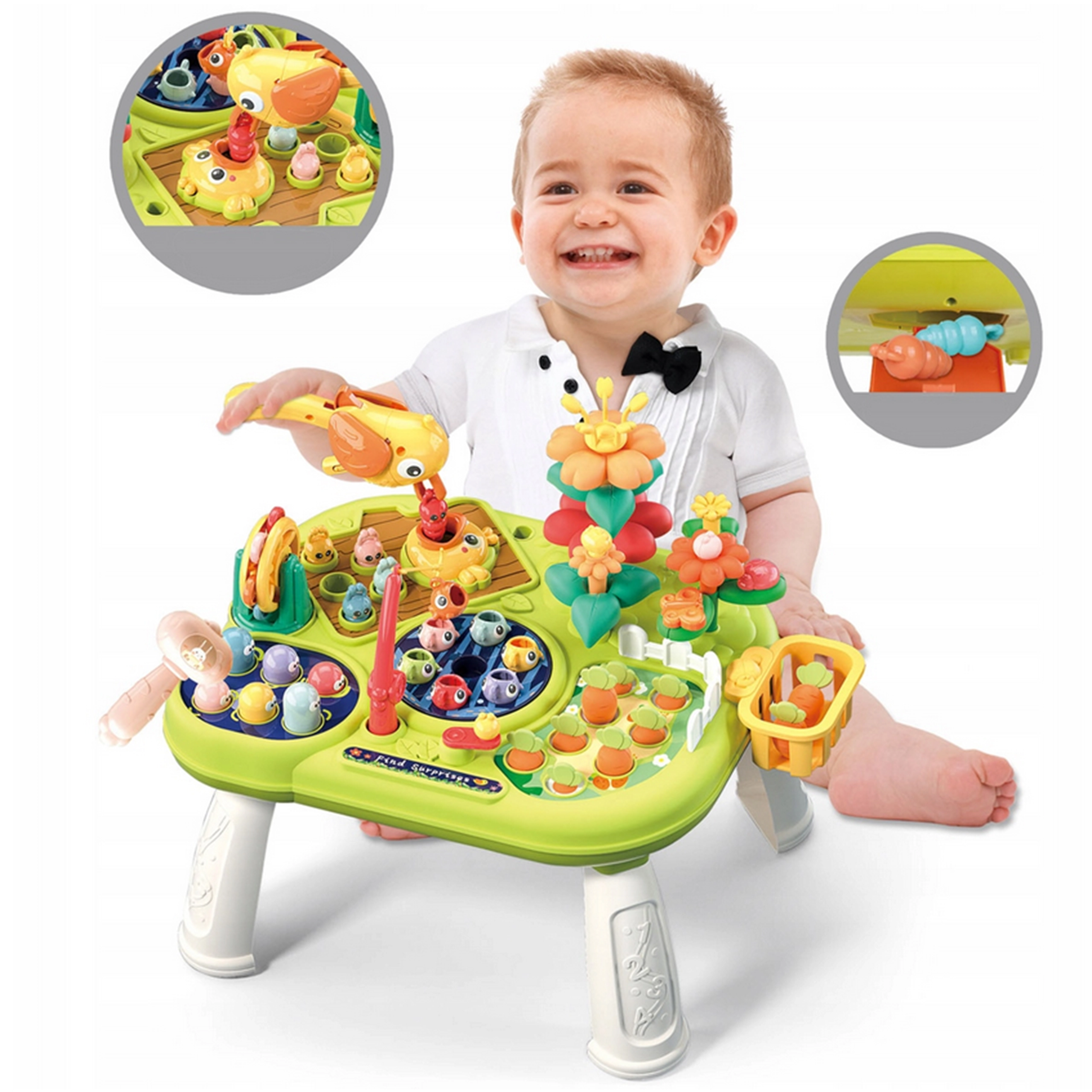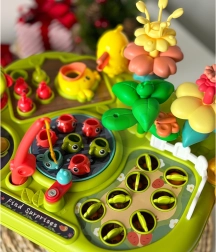 Mida lapsed leiavad? Kalapüügi õngega, ussikeste tagumise haamriga, lillede sorteerimise ja ladumise, porgandite korjamise, linnukese toitmise, pöörleva veski, praktilise korvikese tükkidele ja peidiku ussidele. Iga tegevus arendab eri oskust ja hoiab laste tähelepanu ilma liigse hajumiseta.
