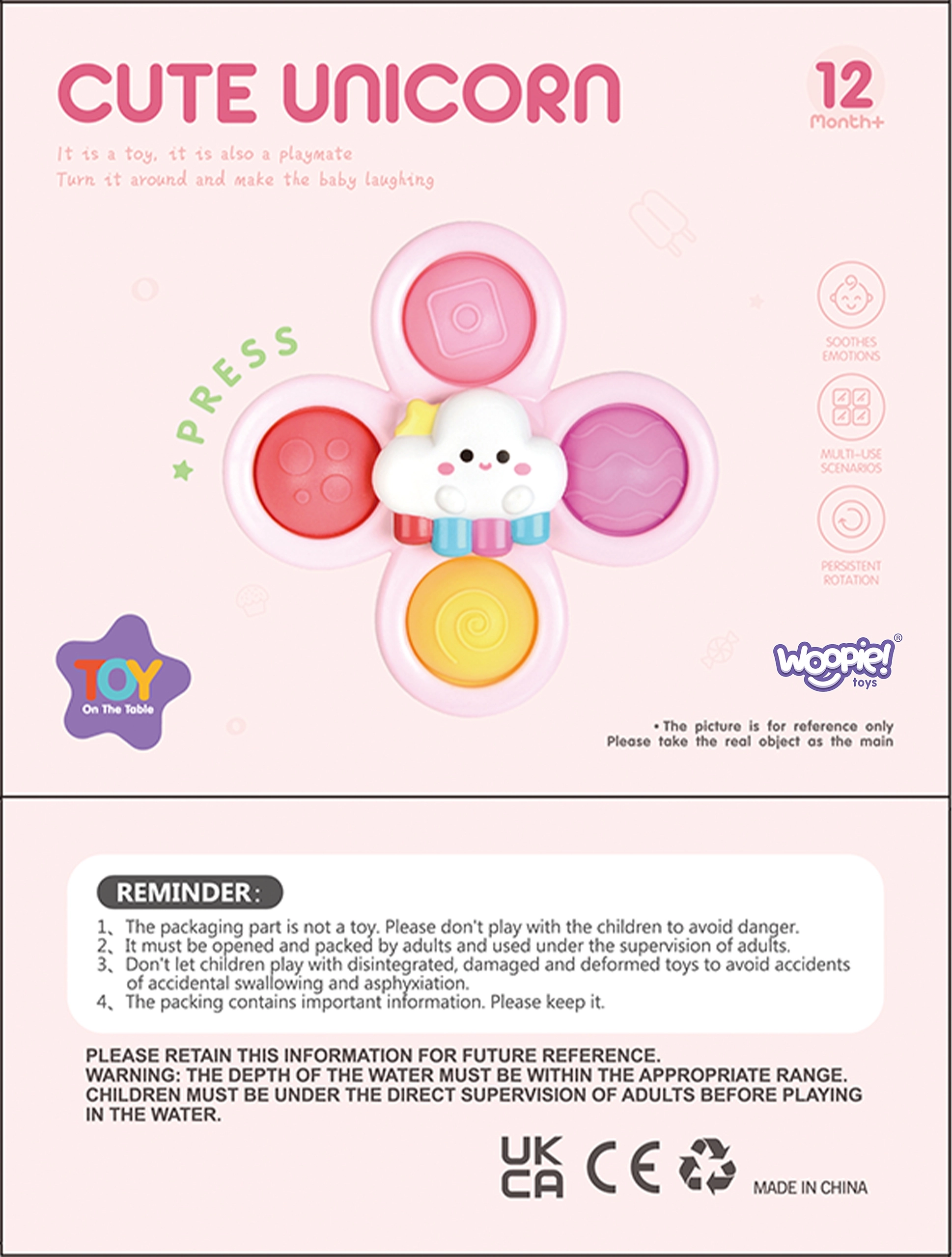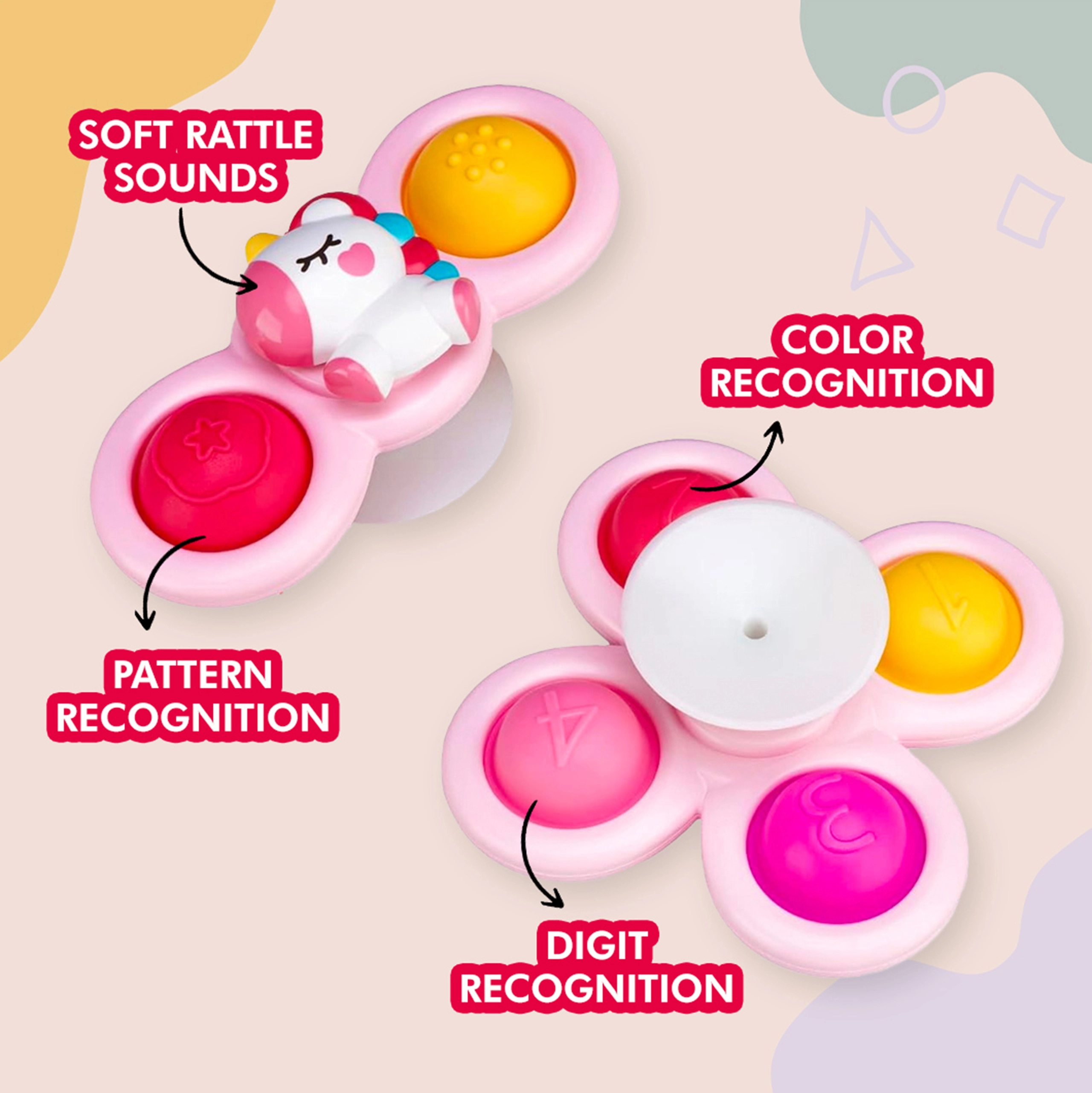 WOOPIE kolme spinneri komplekt üllatab sinu last. Komplektis on ükssarviku, tähe ja pilve kujuga spinnerid. Spinnerid saab kinnitada erinevatele pindadele, nagu aknad või vann vanniskäigu ajal, mänguasi on veekindel. Laagrid tagavad pika pöörlemise ja eemaldatavad osad võimaldavad lõputut loovust nende omavahelisel kombineerimisel. Kummiosadel on erinev pind, mis arendab meeli ja aitab vähendada stressi.