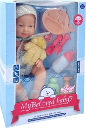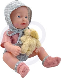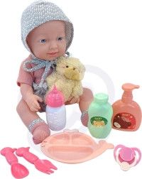 Komplekt sisaldab kõike, mida väikesed hoolitsejad vajavad: riietatud nukku, lutti, karukest, pudelit ja toidunõude komplekti (taldrik, kahvel, lusikas), mida täiendavad kaks „kosmeetika” pudelit vannitamis- ja hooldusstsenaariumideks. Nukul on pehmed, kummist liikuvad jäsemed ja plastikust kere ilma plüüsitäidiseta.