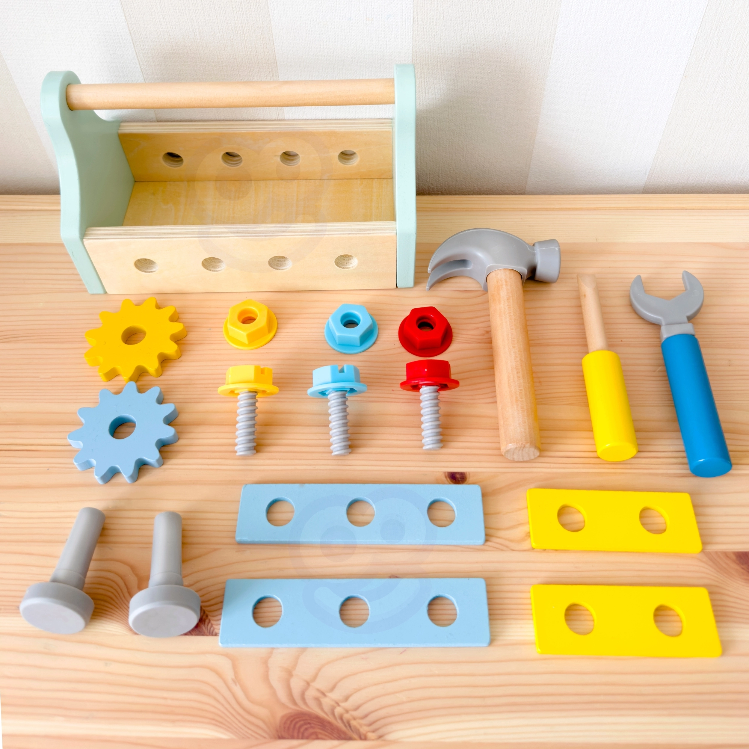 Laste puidust tööriistakomplekt pakub lõbusat ja harivat mängu, mille käigus lapsed proovivad kätt lihtsate meisterdamisoskustega. Realistlikke tööriistu (haamer, kruvikeeraja ja mutrivõti), kruvisid, mutreid, hammasrattaid ja ehitusplaate saab kruvida ja kinnitada kasti avadesse – see toetab loogilist mõtlemist ja lihtsate mehhanismide mõistmist.