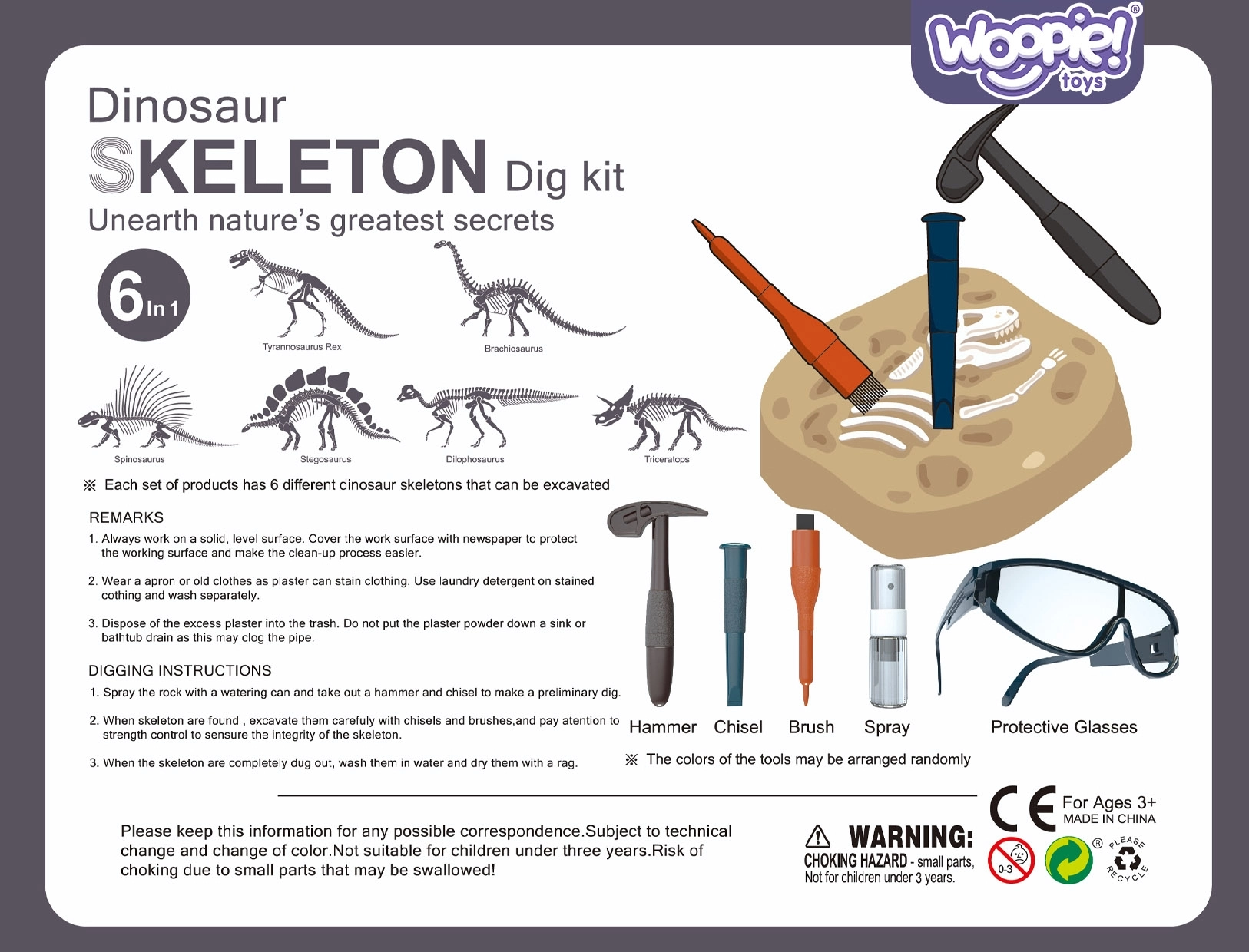 Avasta paleontoloogia võlu Woopie Väikese arheoloogi komplektiga. Lapsed saavad nautida lõbu ja õppimist üheskoos, kui nad ettevaatlikult paljastavad kipsist ja panevad kokku 6 realistlikku dinosauruse skeleti. Praktilised tööriistad ja kaitseprillid tagavad turvalised ja kaasahaaravad kodused katsed, mis arendavad kannatlikkust, peenmotoorikat ja loogilist mõtlemist.