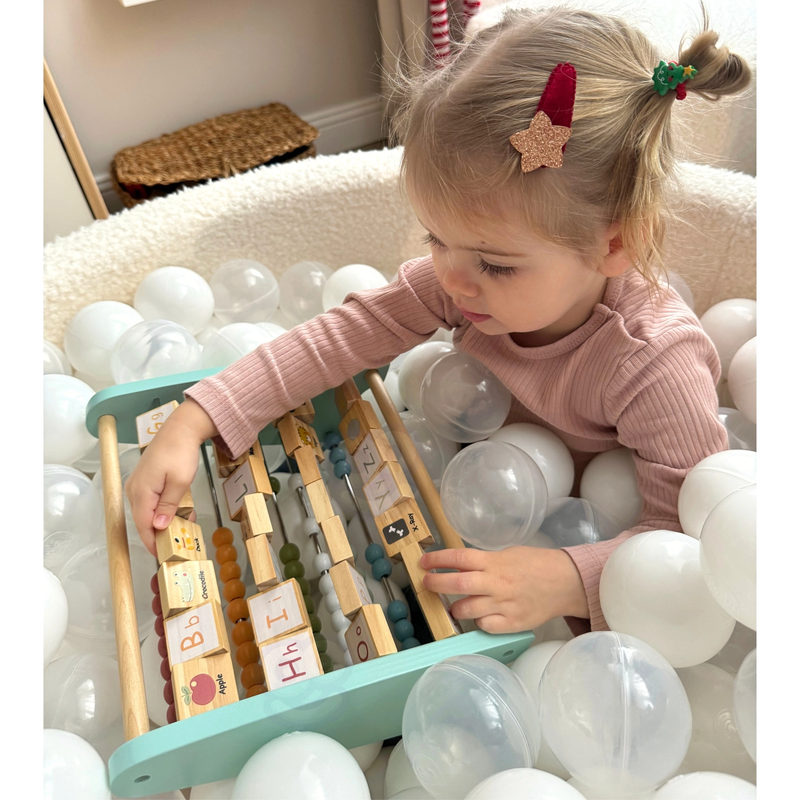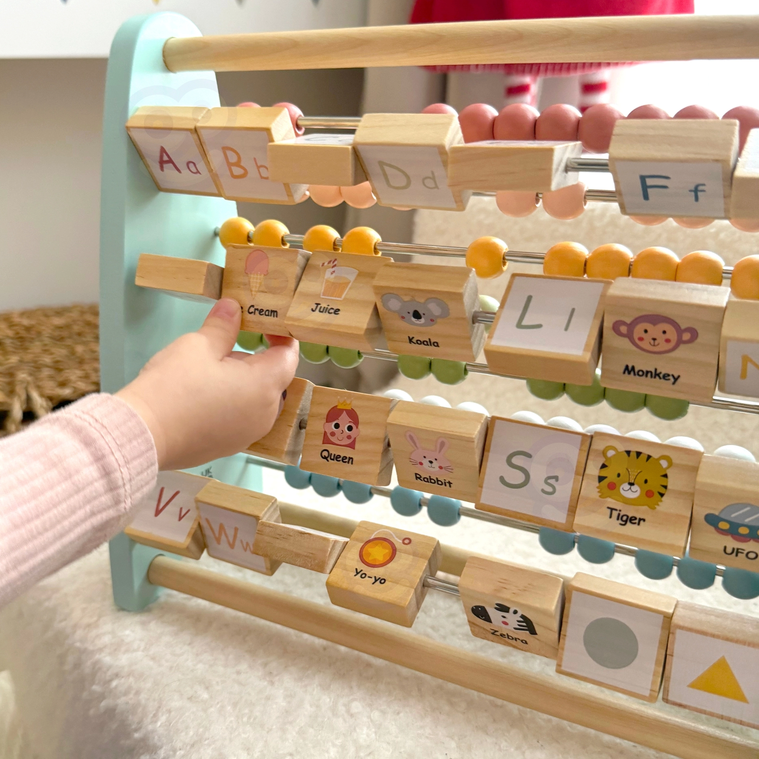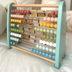 Ühel pool on klassikaline helmestega loendur arvutamiseks, teisel pool pööratavad klotsid tähtede ja piltidega, et õppimine oleks interaktiivne.