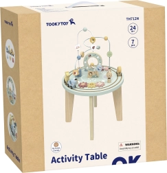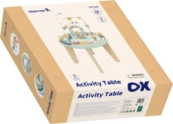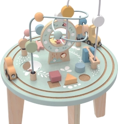 See kvaliteetne puidust laud toob lasteni mitmekesise kujude ja värvide maailma. Kahe rajaga motoorikalabürint treenib sõrmede osavust, kujude sorteerija õpetab tundma kujundeid ja värve, hammasrattad arendavad loogikat ja põhjus-tagajärg seoseid ning rongike armsate loomadega sõidab ümber laua.