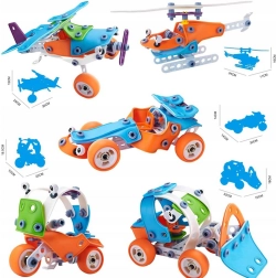 See komplekt sisaldab 118 elementi, mis võimaldavad luua erinevaid sõidukeid, nagu buldooser, helikopter, lennuk või kardiauto. See aitab arendada loovust ja käelisi oskusi, võimaldades lastel avastada ehituse ja disaini maailma suure rahulolu ja rõõmuga.