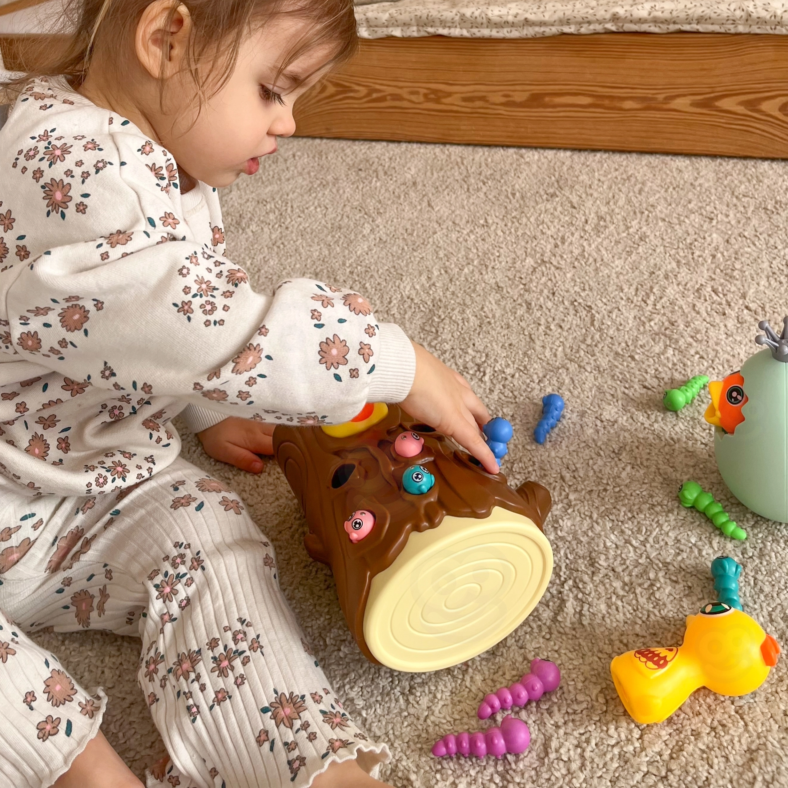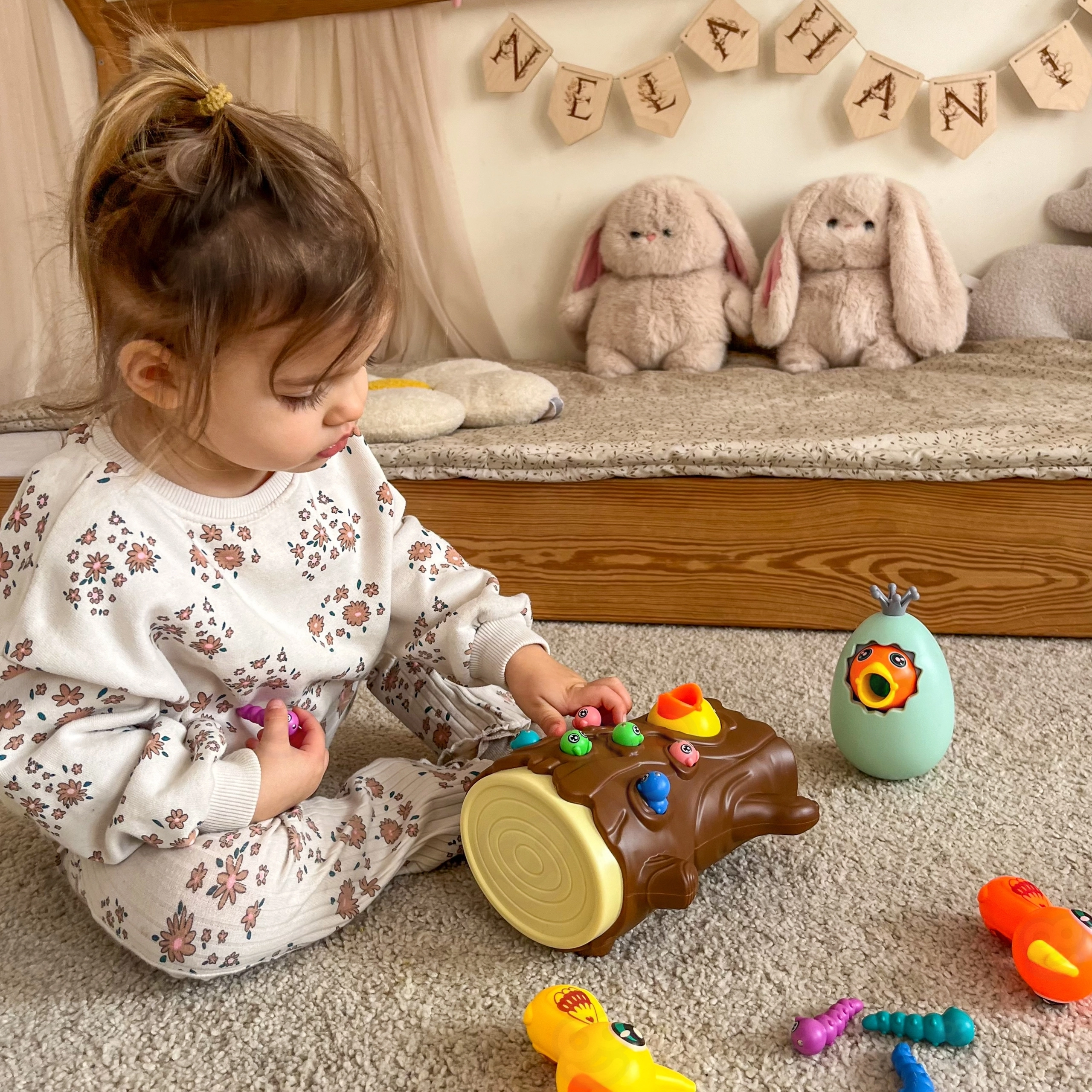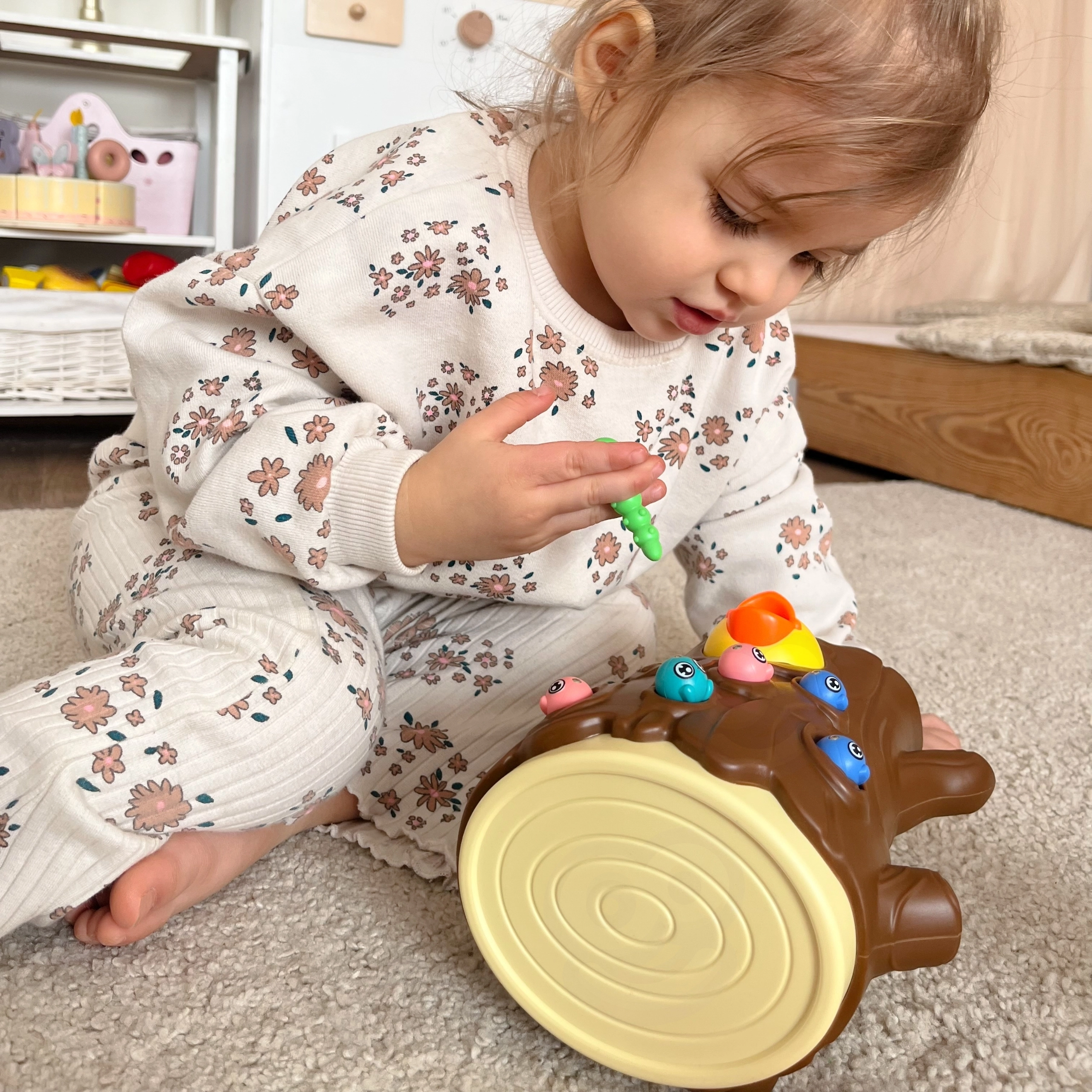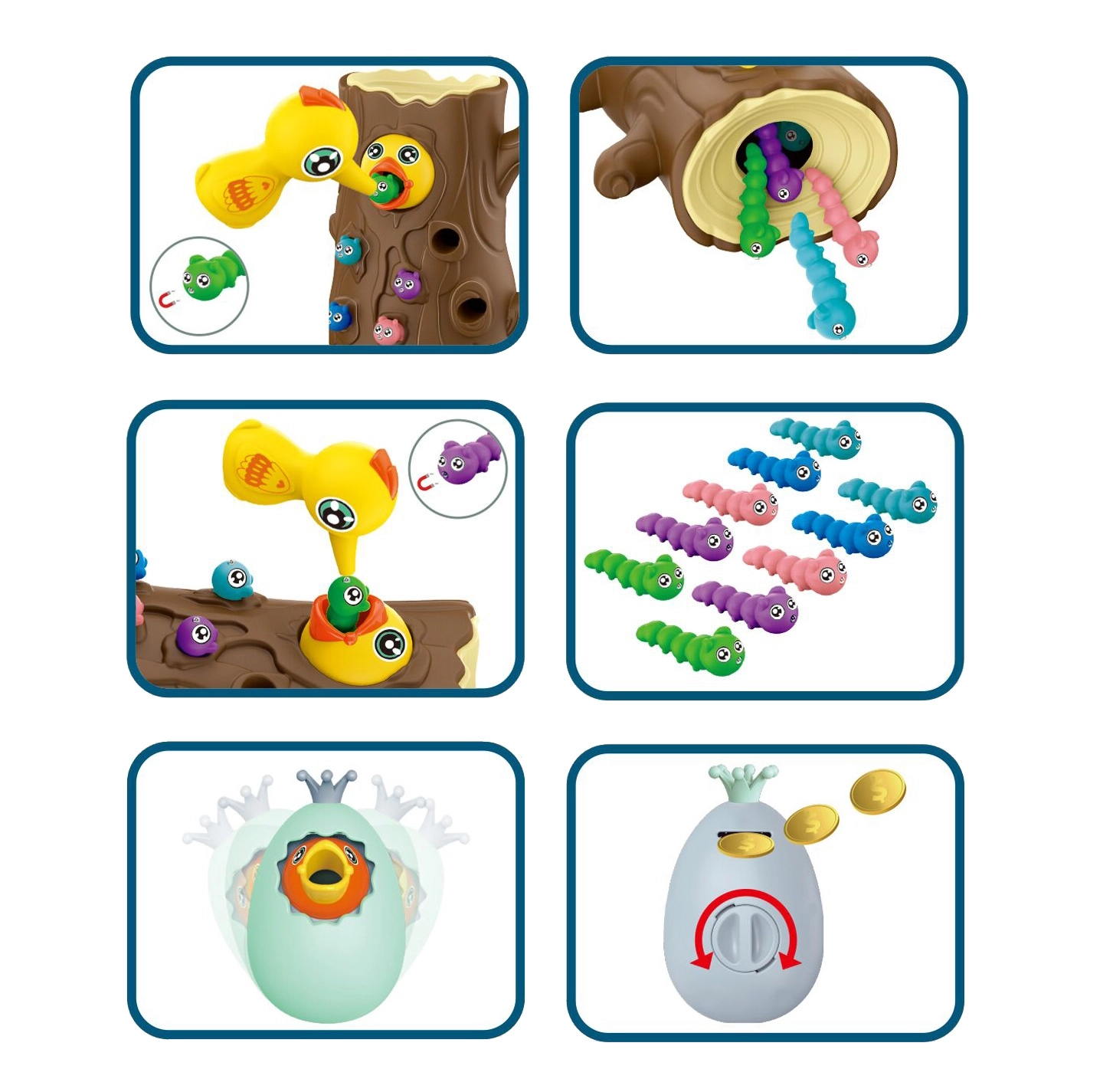 Lõbus magnetmäng 3-ühes kaubamärgilt WOOPIE ühendab õppimise läbi mängu ja terve pere lõbu. Lapsed „püüavad” magnetiliste nokkade abil ussikesi ja toidavad kännus pesitsevat linnupoega, arendades peenmotoorikat, silma–käe koordinatsiooni ja tähelepanuvõimet. Munakest saab kasutada nii rahakassana kui ka pöördkukutisena; mäng sobib kahele mängijale ning toetab suurepäraselt kannatlikkust ja täpsust.