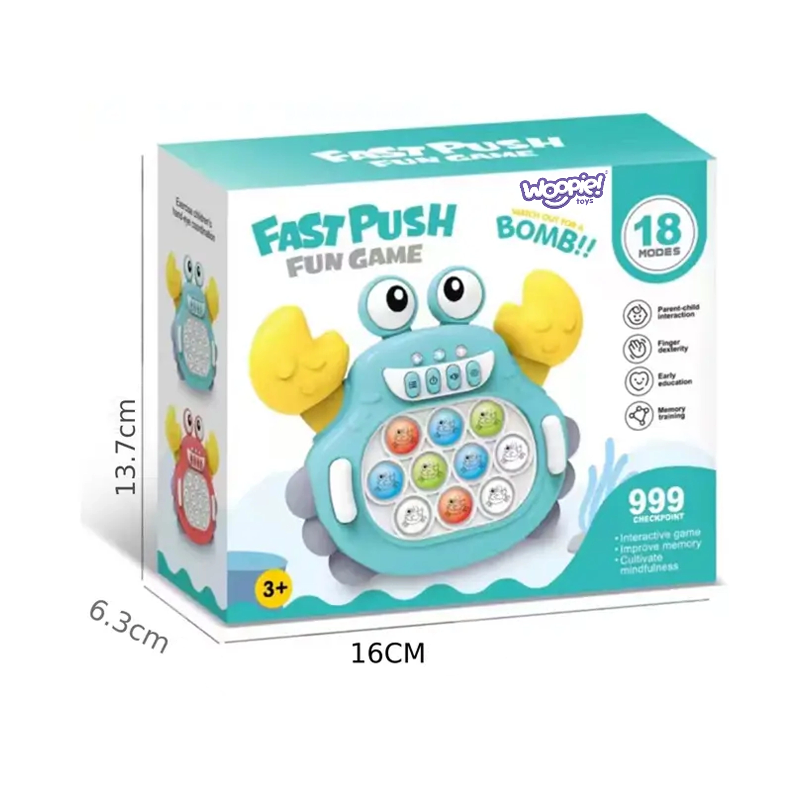 Elektrooniline mänguasi Pop It krabi on suurepärane viis arendada laste mõtlemist, käelist osavust ja koordinatsiooni. Tänu kompaktsusele saab seda kõikjale kaasa võtta. Mänguasi on mõeldud lastele alates 3. eluaastast ning pakub kuni 999 taset, mis tagavad rohkelt meelelahutust ka täiskasvanutele.