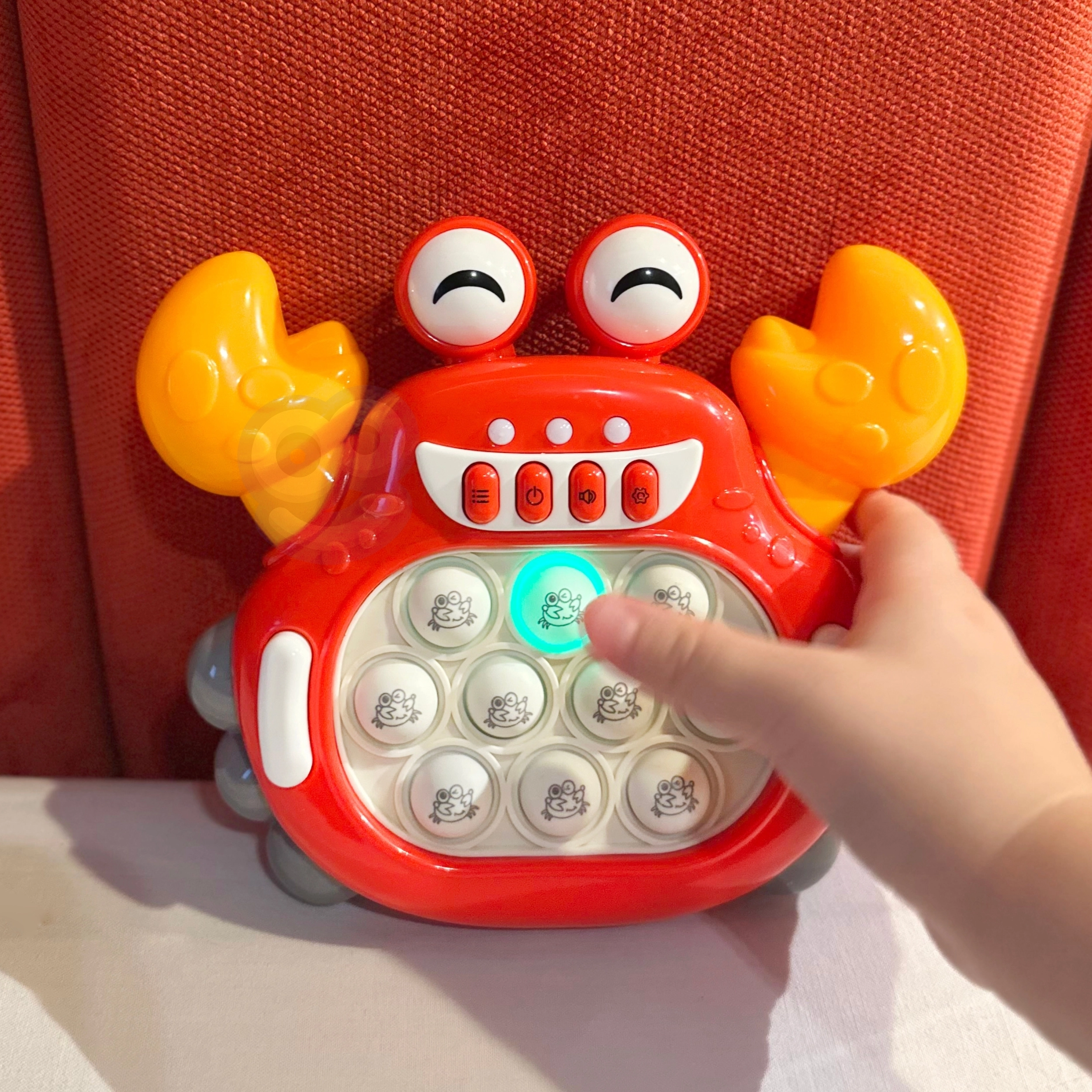 Krabikujuline disain suurte silmade ja kollaste sõrgadega meelitab lapsi suhtlema ja arendab peenmotoorikat.