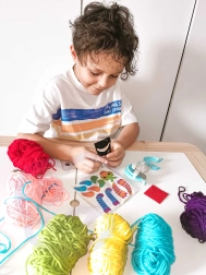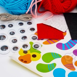 Komplektis on 6 eri värvi lõnga, mis võimaldavad lastel luua värvikirevaid tegelasi.