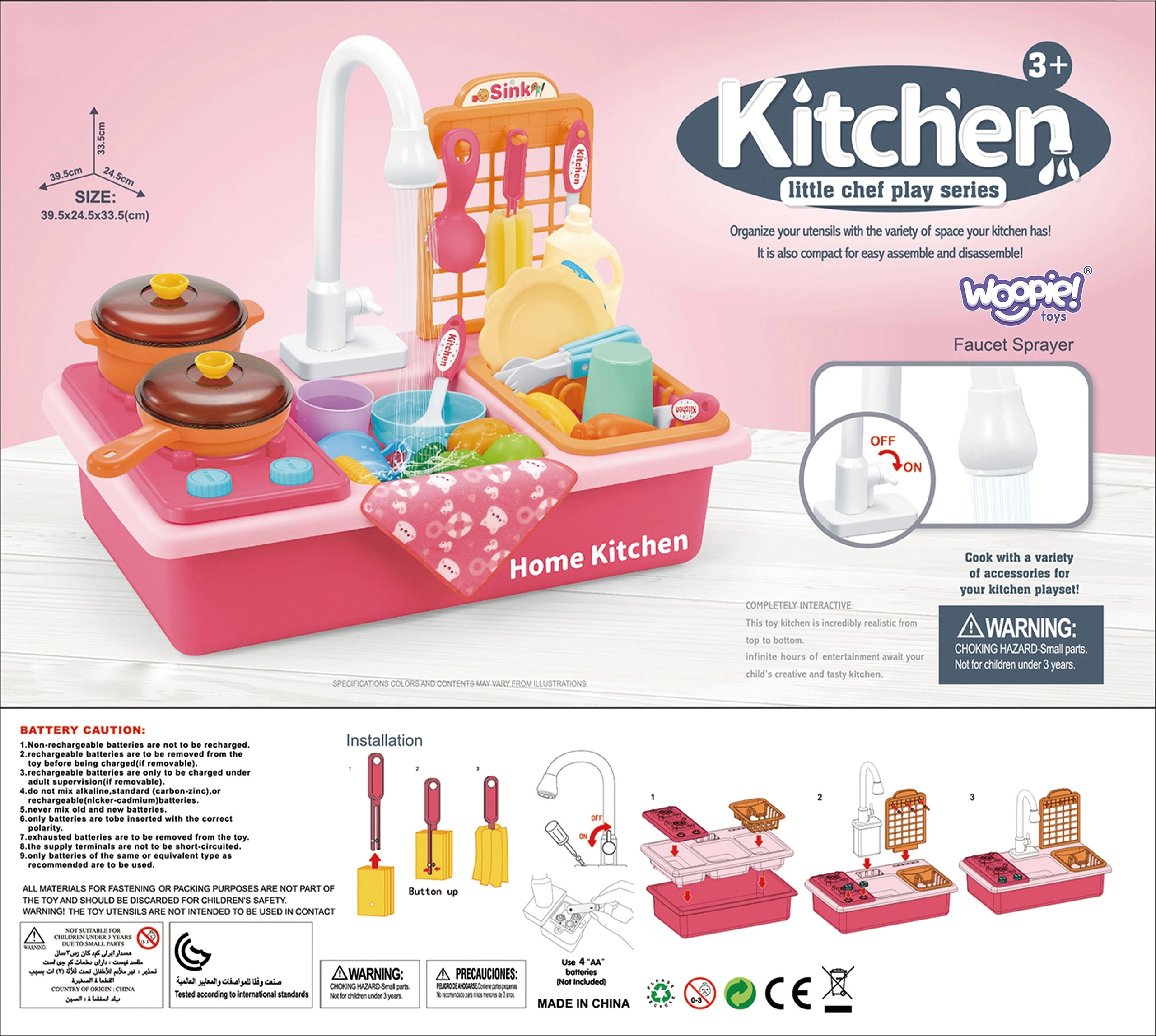 See laste köögimäng Woopie kaubamärgilt on loodud pakkuma rollimängu realistliku tunnetusega. Valamust voolab päris vesi tänu sisseehitatud pumbale, mida lapsed saavad ise kasutada. Nii arenevad nende motoorsed oskused ja iseseisvus.