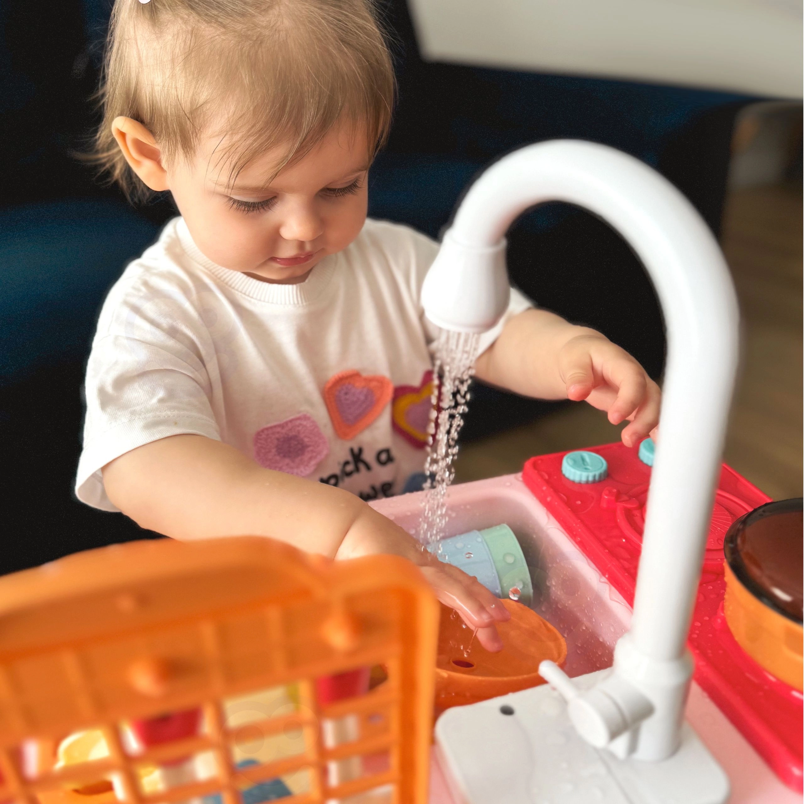 Sisseehitatud pumba abil saab vesi vabalt kraanist voolata, kui lapsed täidavad kausi. See interaktiivne lahendus annab mängule ehtsa tunde.