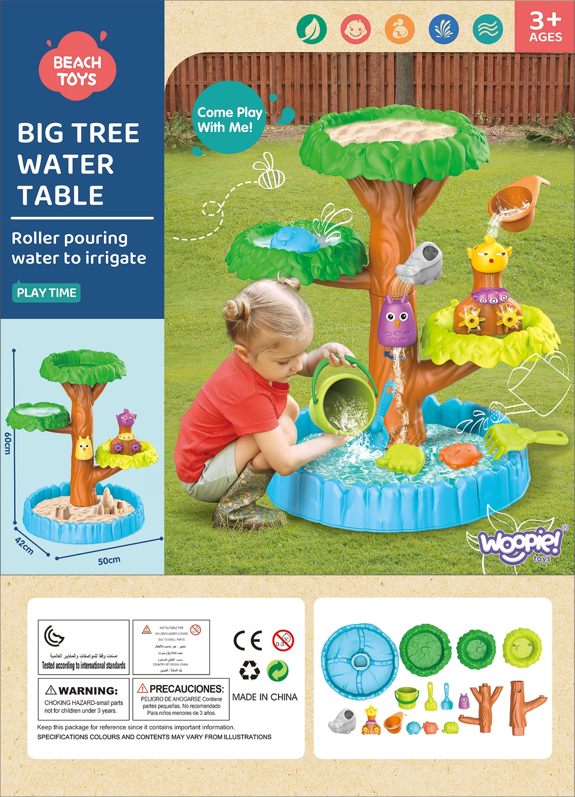 Puu kujuline veelaud kaubamärgilt Woopie on ideaalne mängimiseks vee ja liivaga. Komplekt sisaldab kõike lõputuks lõbuks – kokkupandav laud, ämber, kastekann-täiteanum, kolm vormi, kaks labidat, kastekann. Laps saab kasta veega erinevaid loomakesi, mis paneb hammasrattad pöörlema ning lisab juba niigi vahvale mängule veelgi rõõmu.