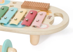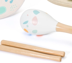 Komplekt sisaldab viit pilli: metallofon, marakad, trumm ja kaks pulka – ideaalne muusika avastamiseks.