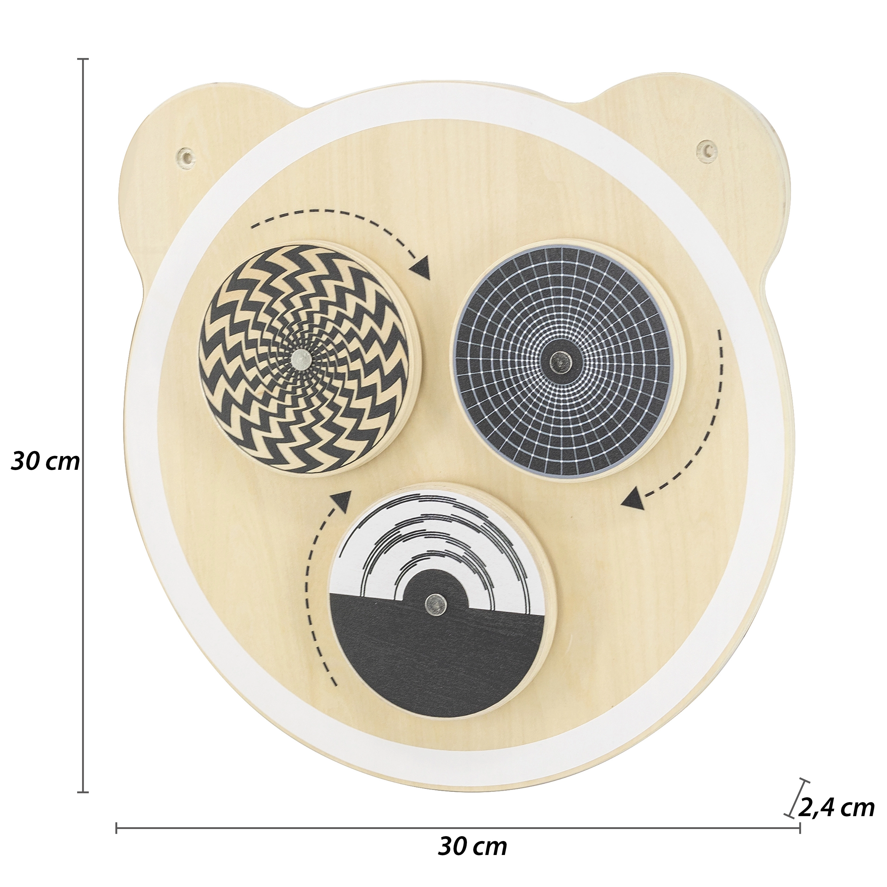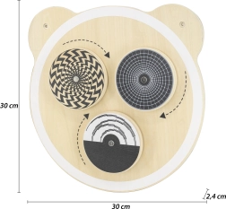 Puidust seinapaneel karu motiiviga on ideaalne laste loogilise mõtlemise ja kujutlusvõime arendamiseks. See sisaldab kolme ümmargust elementi, mis pöörlemisel loovad optilisi illusioone, ning on värvitud mittetoksiliste värvidega erksates toonides. See mänguasi rõõmustab igat last ja sobib nii koju kui ka haridusasutustesse.
