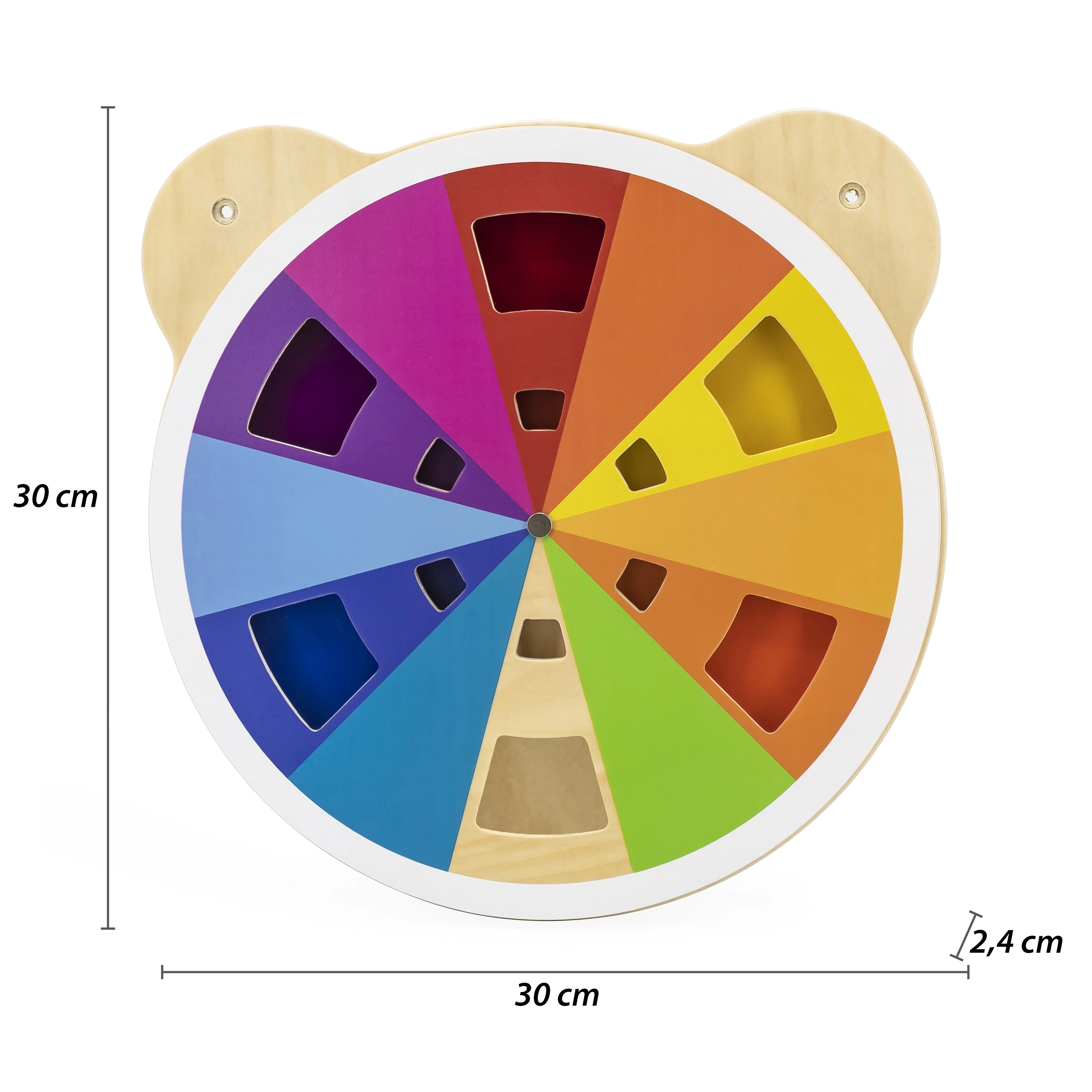 Karukujuline puidust värvisegamislaud on mitte ainult esteetiliselt köitev, vaid ka õppevahend lastele alates 18. elukuust. Akrüülketast pöörates saavad lapsed segada värve ja avastada uusi. Iga pöördega tekivad ainulaadsed värvid, mis lapsi köidavad.