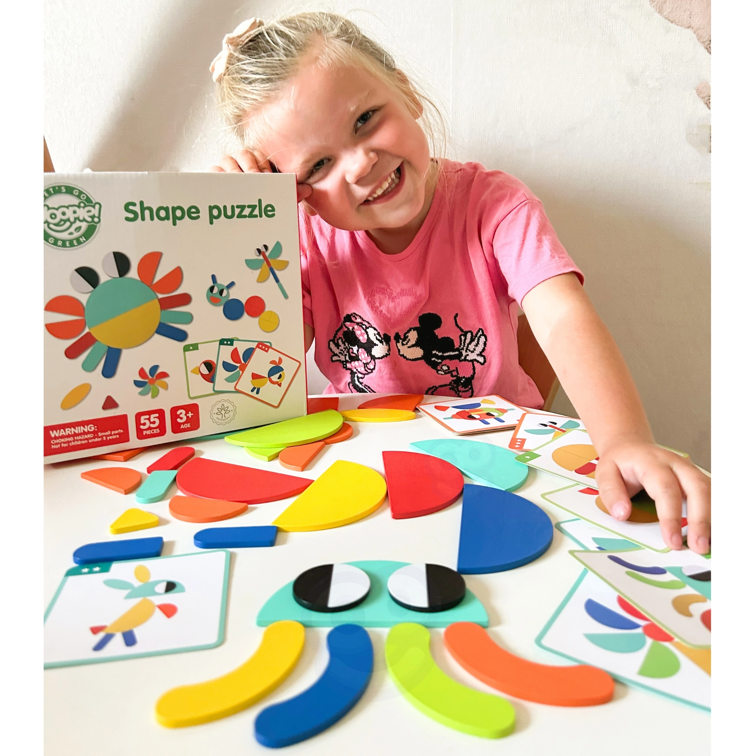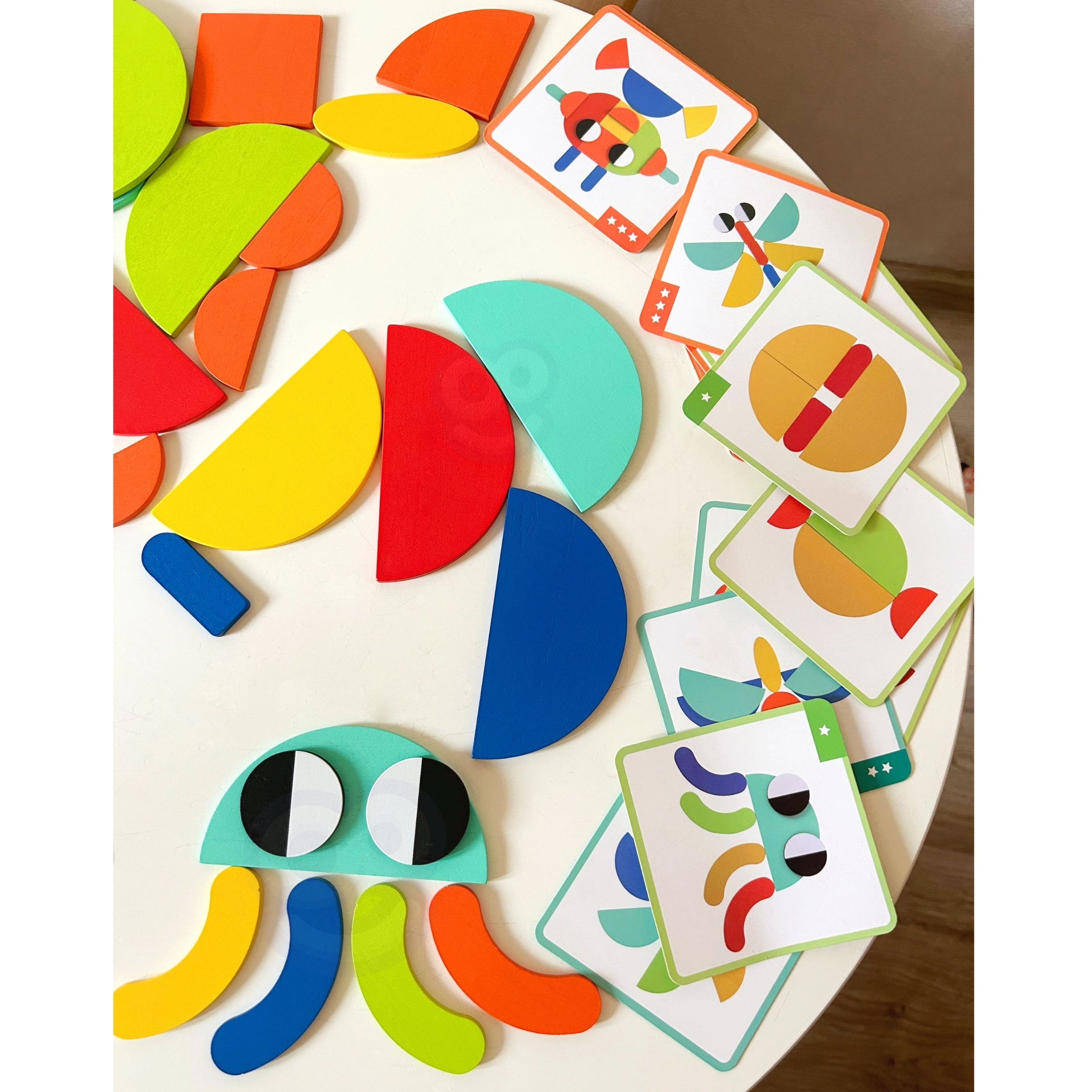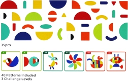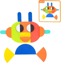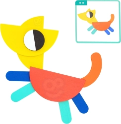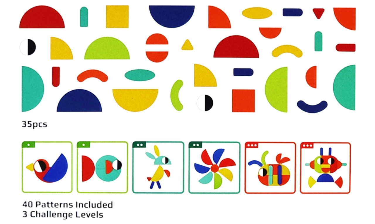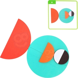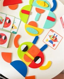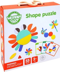 See nutikas pusle ühendab värvilised puidust kujundid ja kahepoolsed etteandekaardid, aidates lastel harjutada kujundite ja värvide äratundmist, ruumilist mõtlemist ning liigutuste täpsust. Võib laduda kaartide järgi või luua täiesti oma pilte – fantaasial pole piire.
