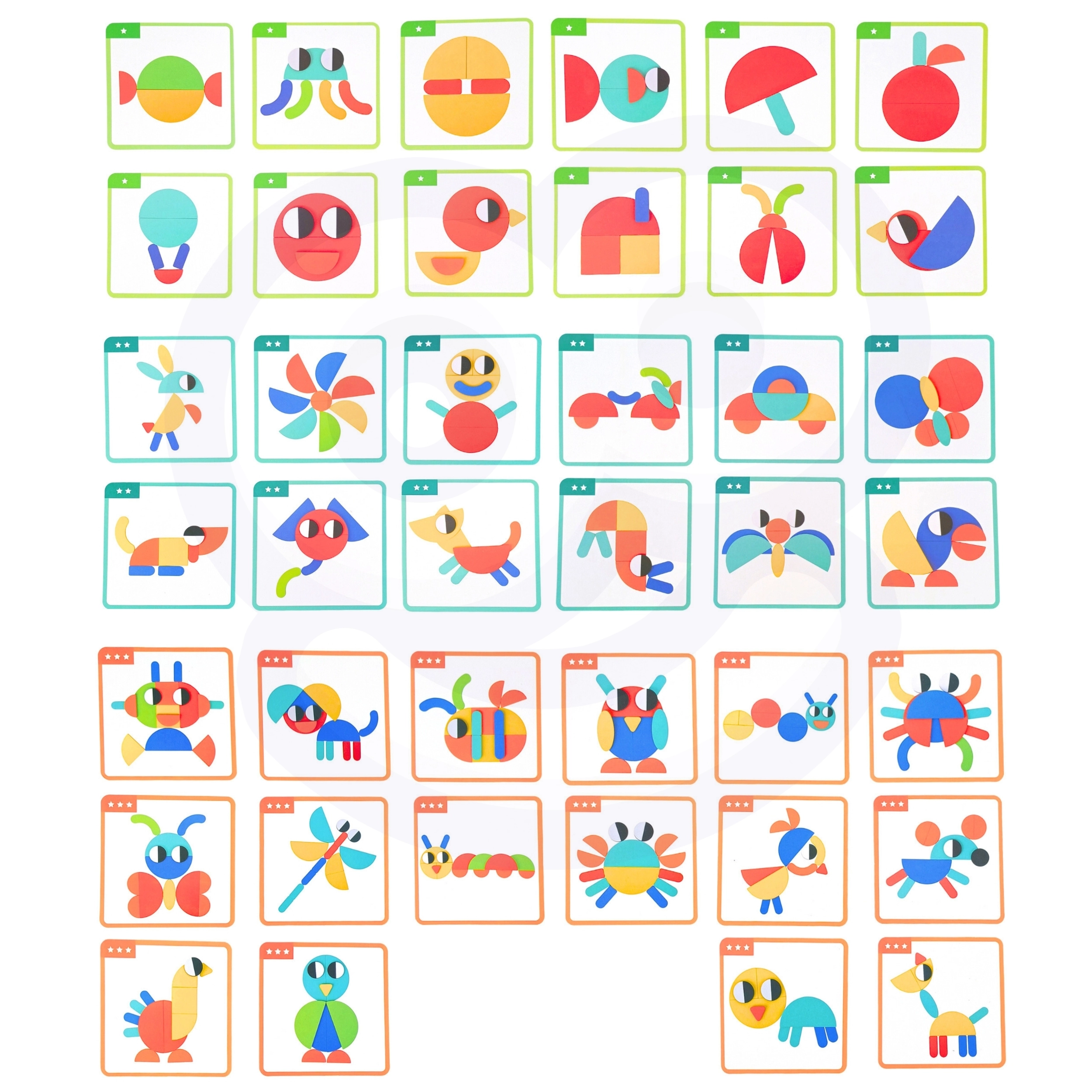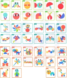 Lapsed panevad värvilisi kujundeid kokku kahepoolselt trükitud kaartide järgi või loovad oma pilte. Nad harjutavad kujundite ja värvide tajumist, keskendumist ning liigutuste täpsust – lõbus õpe, mis tõesti köidab.
