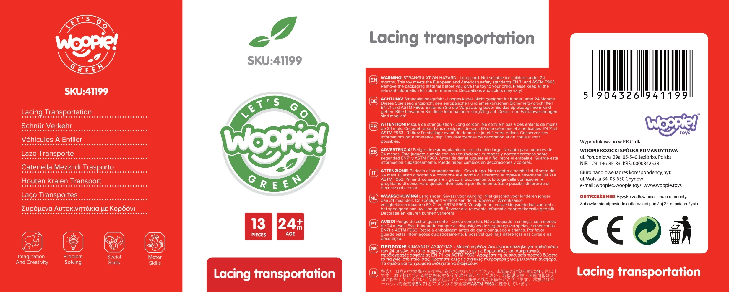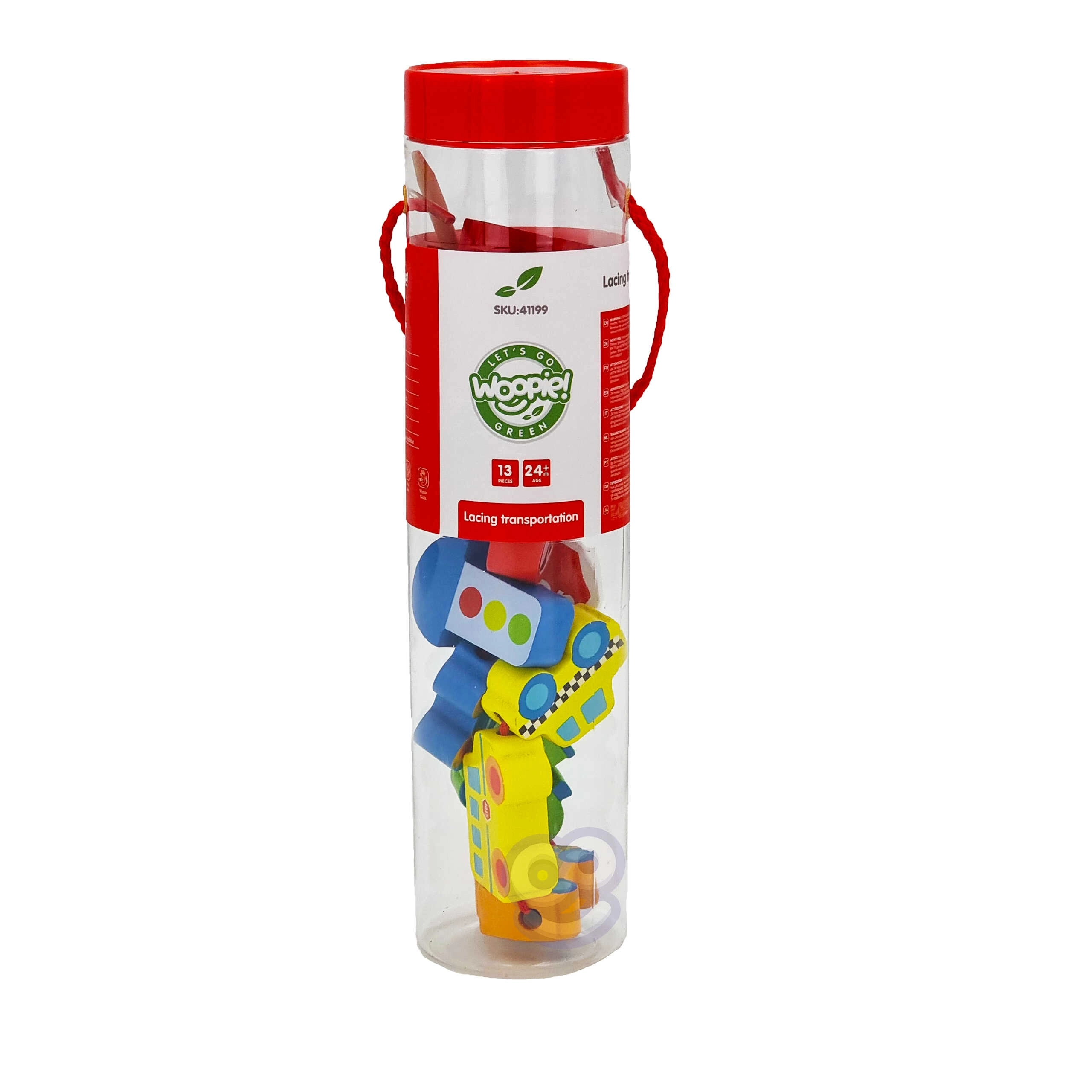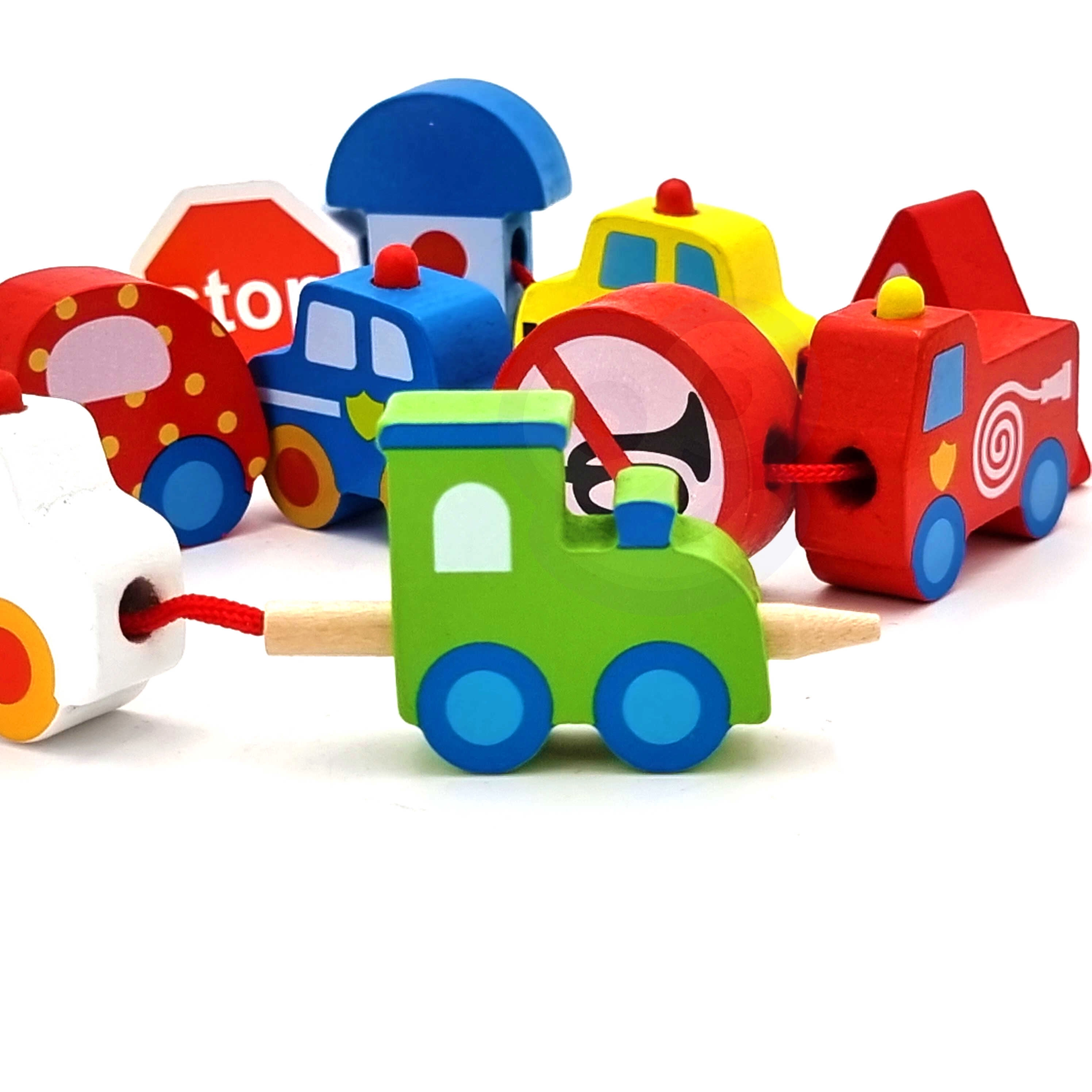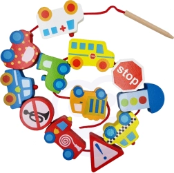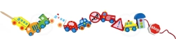 Komplekti kuulub 12 puidust klotsi sõidukimotiividega ja 1 nöör puidust pulgakesega lihtsaks läbilükkamiseks. Tükke nöörile lükates saab luua oma „kolonne“ või linnajutte – alates tuletõrjeautost ja politseiautost kuni bussi ja liiklusmärkideni.