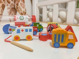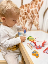 Nööri läbilükkamine tükkide avadest treenib sõrmede täpsust, haaret ja silma–käe koordinatsiooni – ideaalne alates 2. eluaastast.
