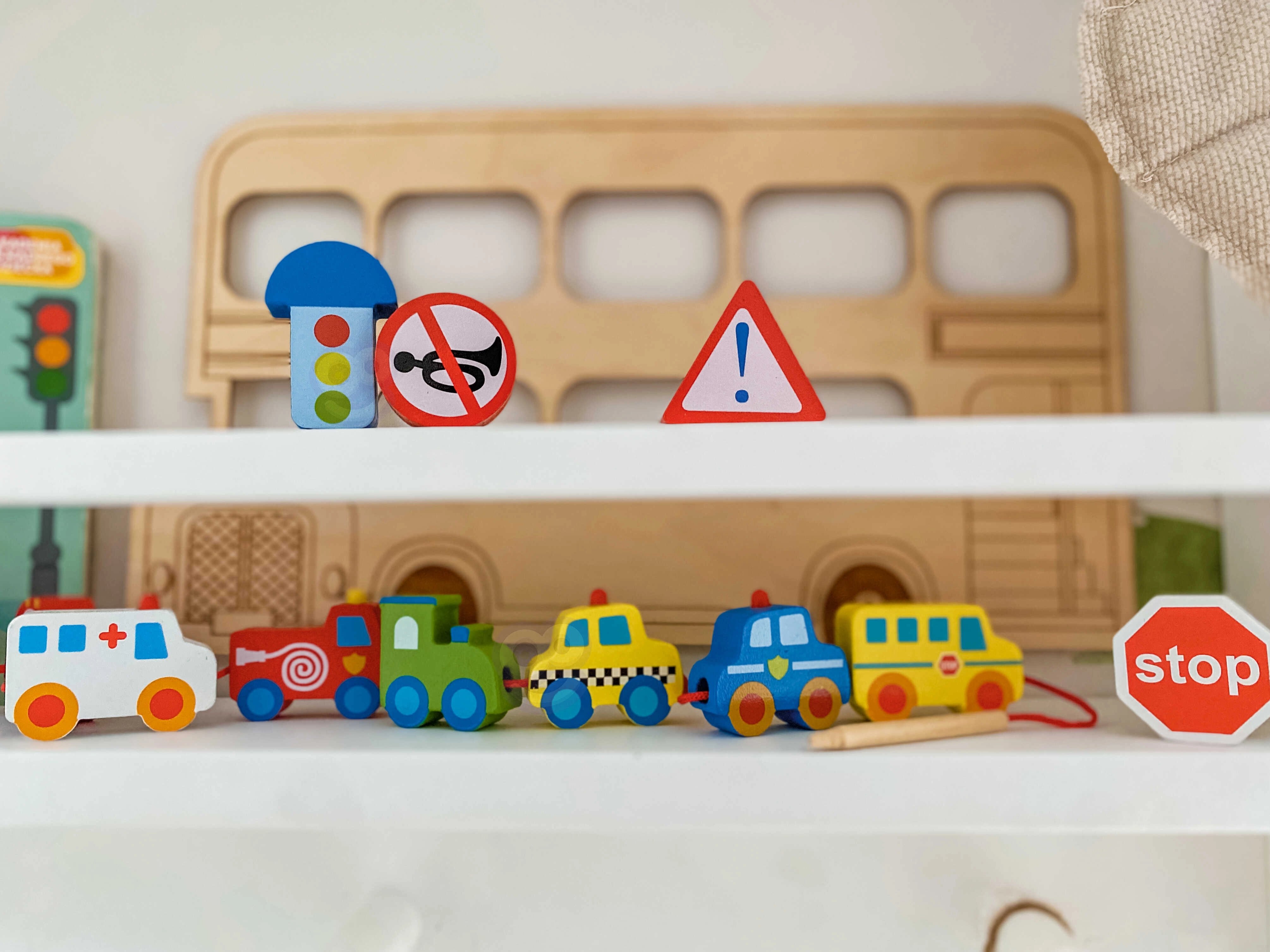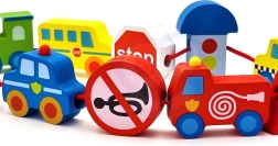 Värvilised puidust tükid kujutavad autosid, bussi, traktorit, kiirabi ja ka liiklusmärke – lapsed tutvuvad mänguliselt liiklusmaailmaga.
